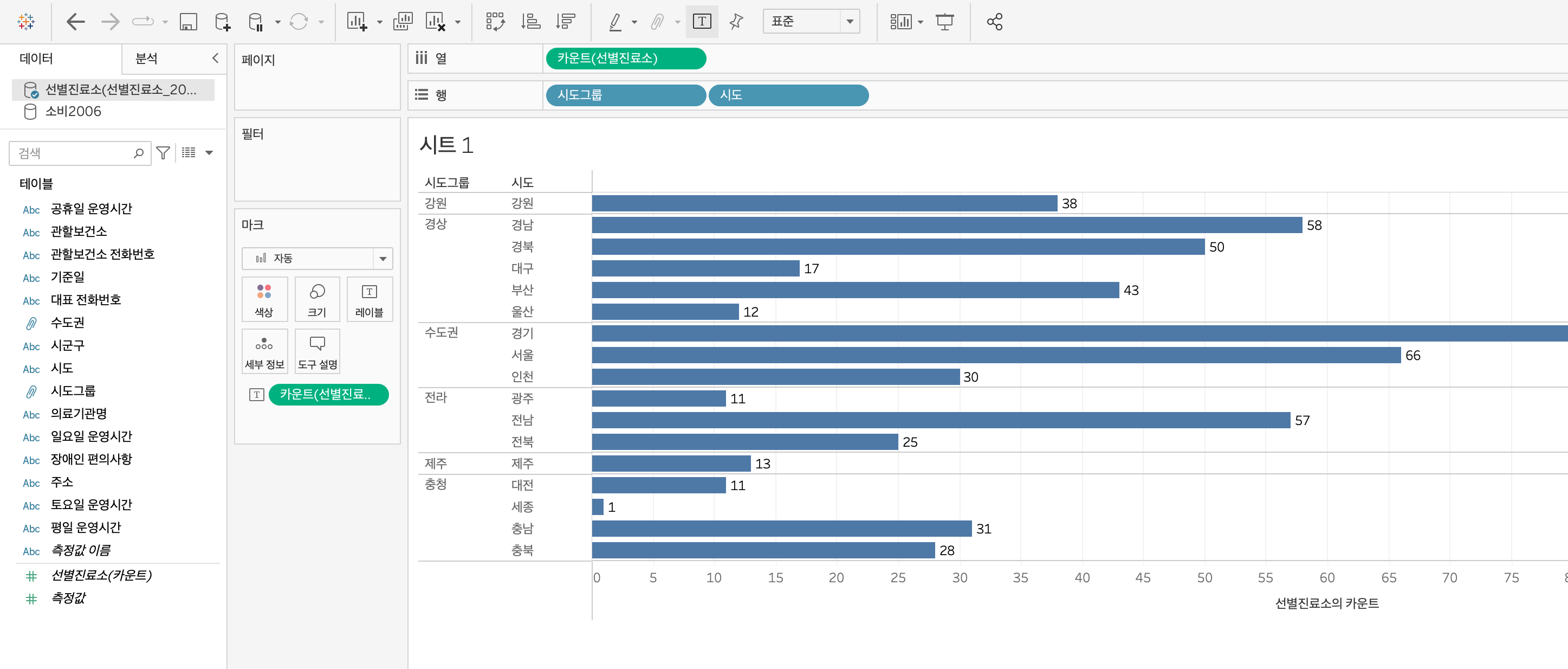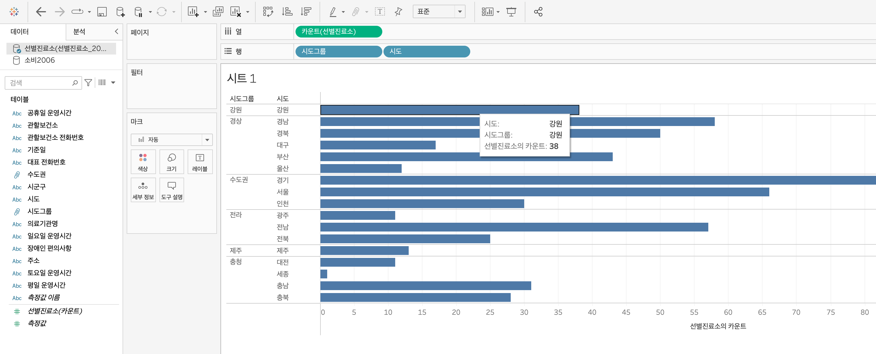 참고로, 연습용 데이터로써 코로나19 선별진료소 현황 파일을 다운로드하고 지역별로 선별진료소 수를 막대차트로 나타내 봤습니다. 자세한 내용은 아래의 포스팅을 참고해 주세요.