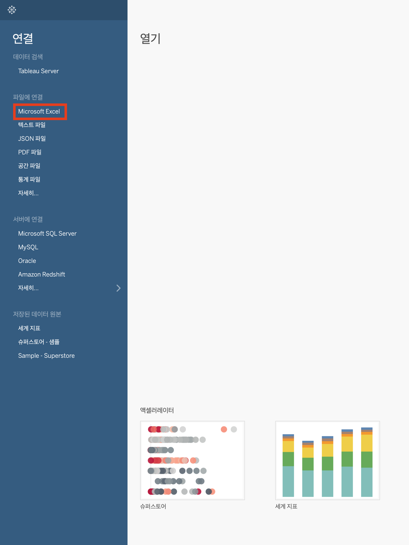 태블로를 실행하고 아래의 그림 1과 같이, Excel 파일 연결을 클릭합니다.