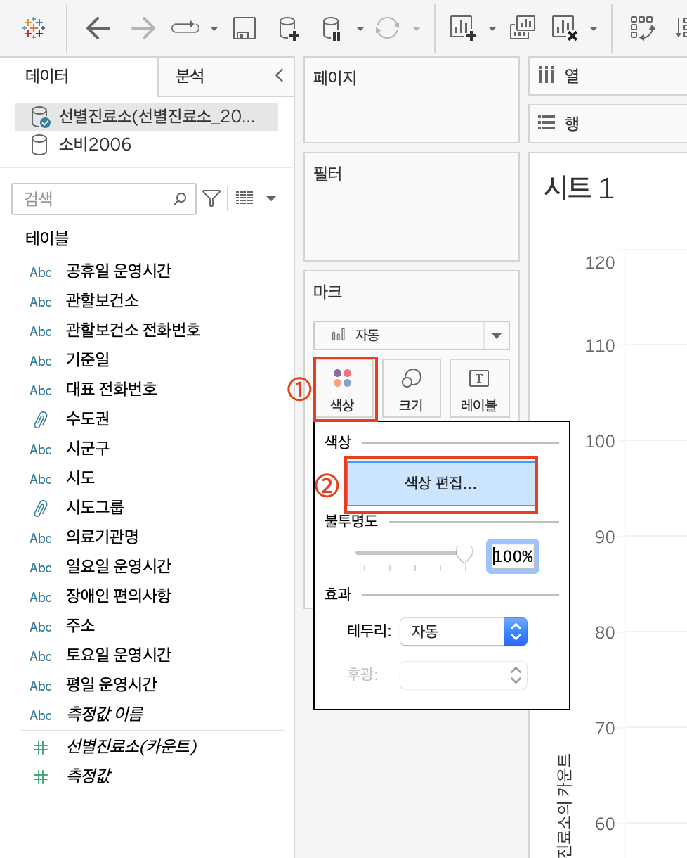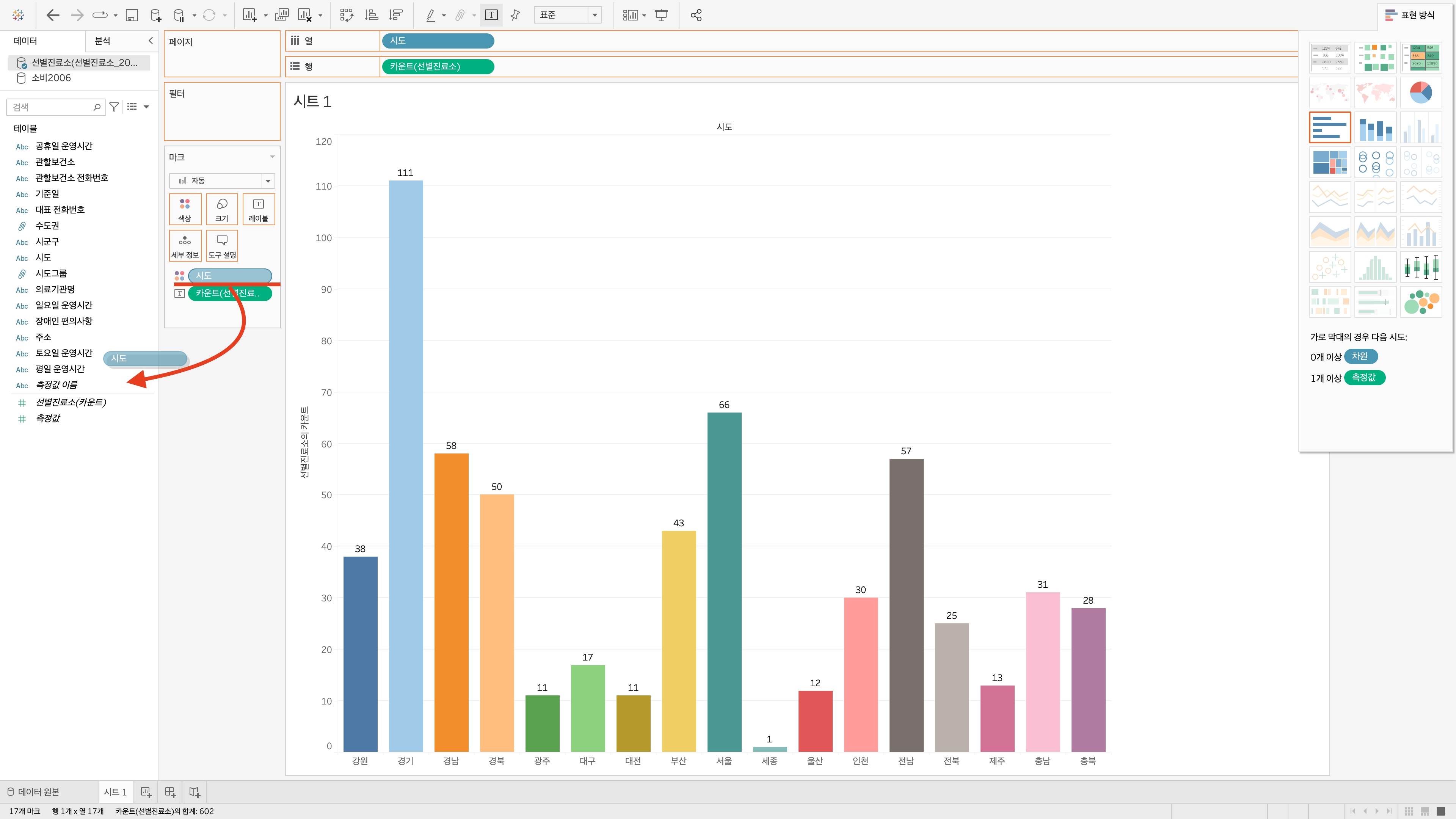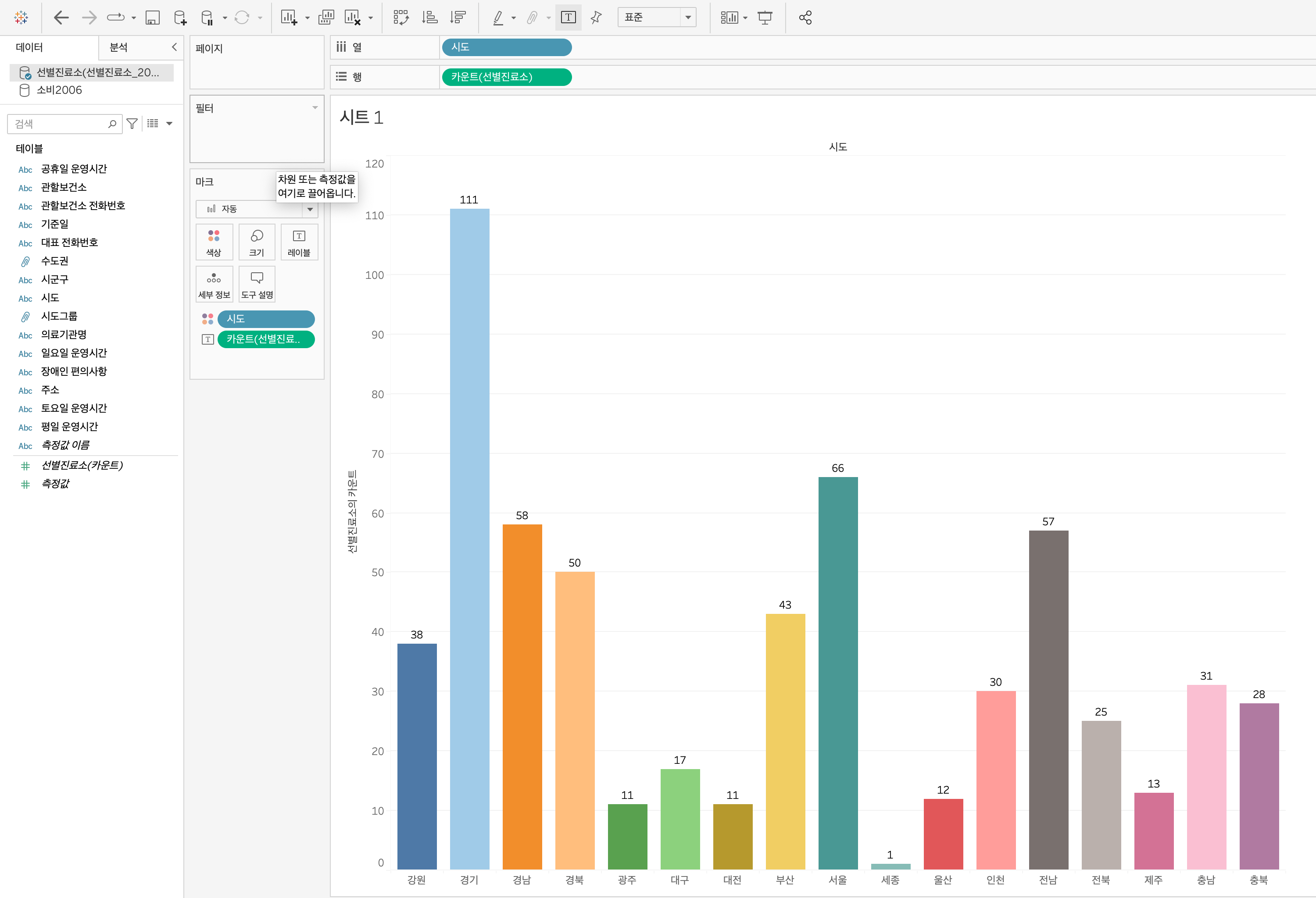 아래의 그림 6과 같이, 좌측에 '시도' 차원 필드를 드래그하시고, 바로 우측 '마크' 내 '색상'에 드롭합니다.
