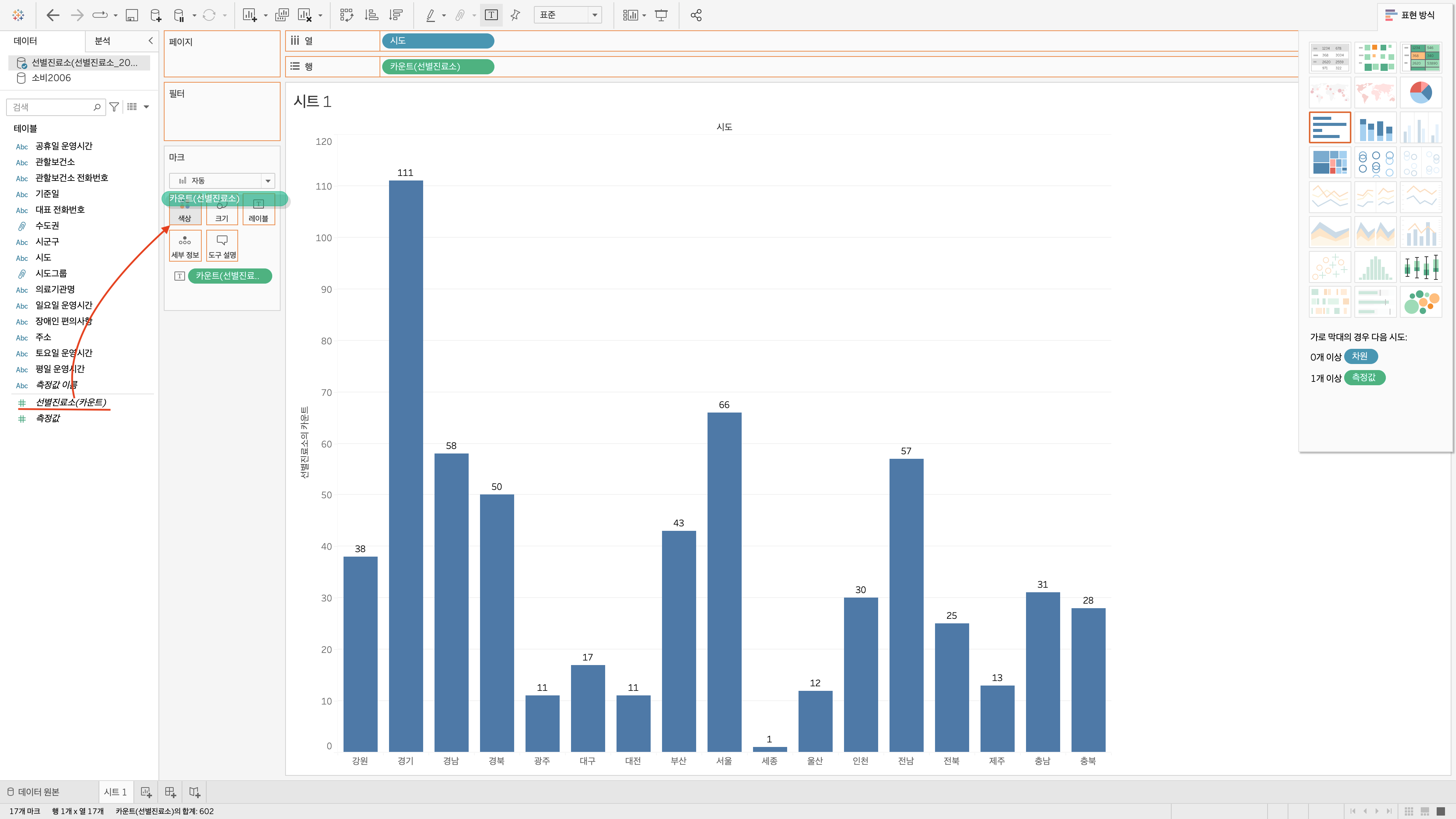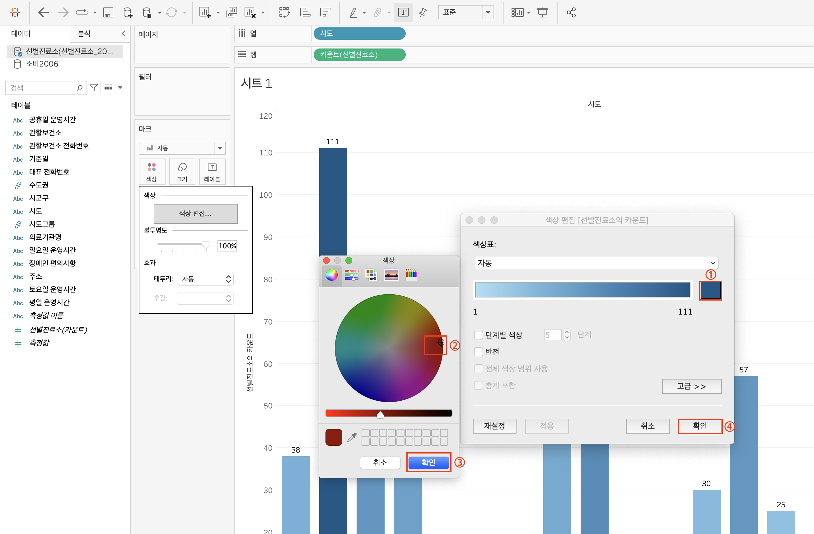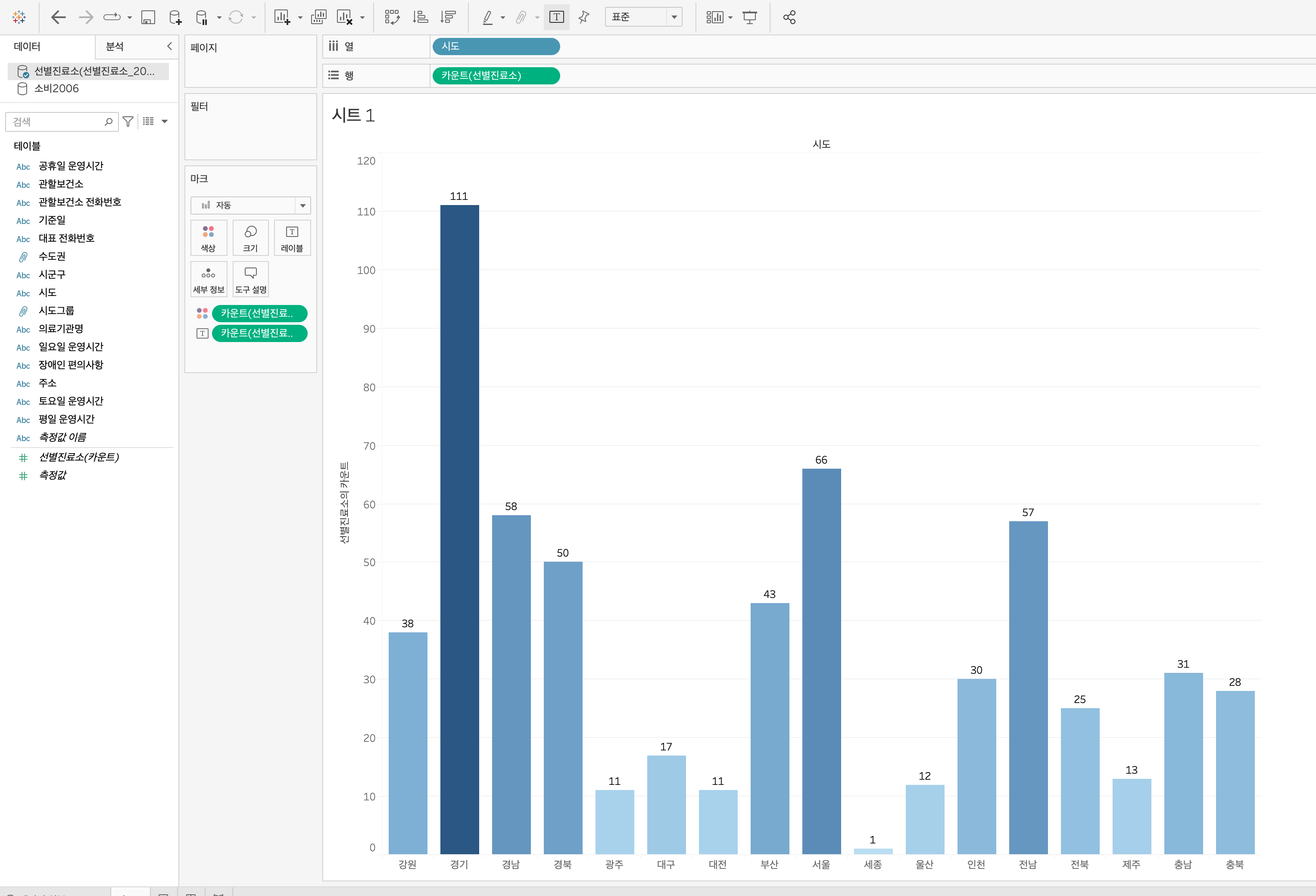 아래의 그림 6과 같이, 좌측에 '시도' 차원 필드를 드래그하시고, 바로 우측 '마크' 내 '색상'에 드롭합니다.