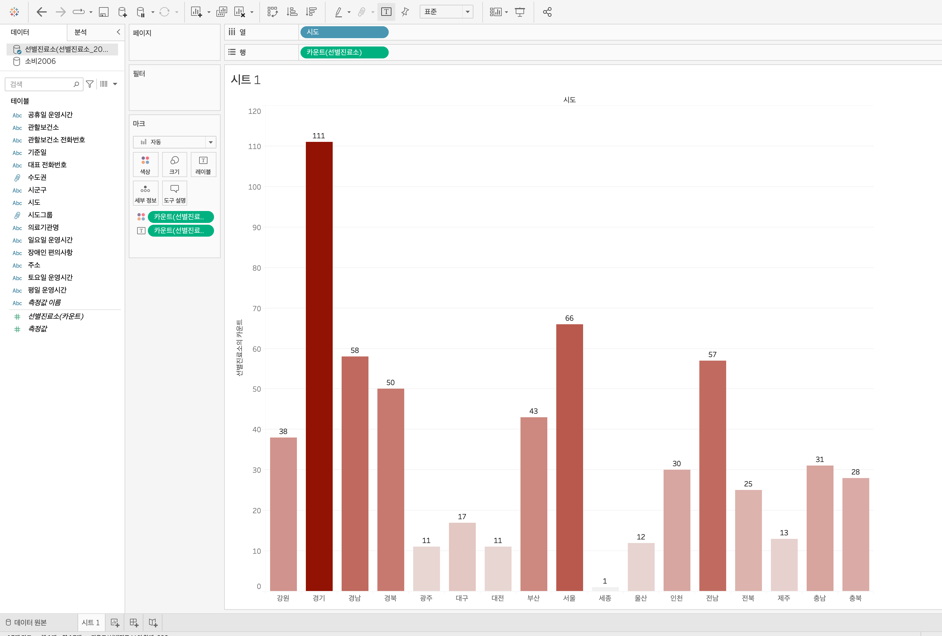 다음으로 '선별진료소(카운트)' 측정값을 더블 클릭하면 아래의 그림 5와 같은 막대 차트가 시각화됩니다.