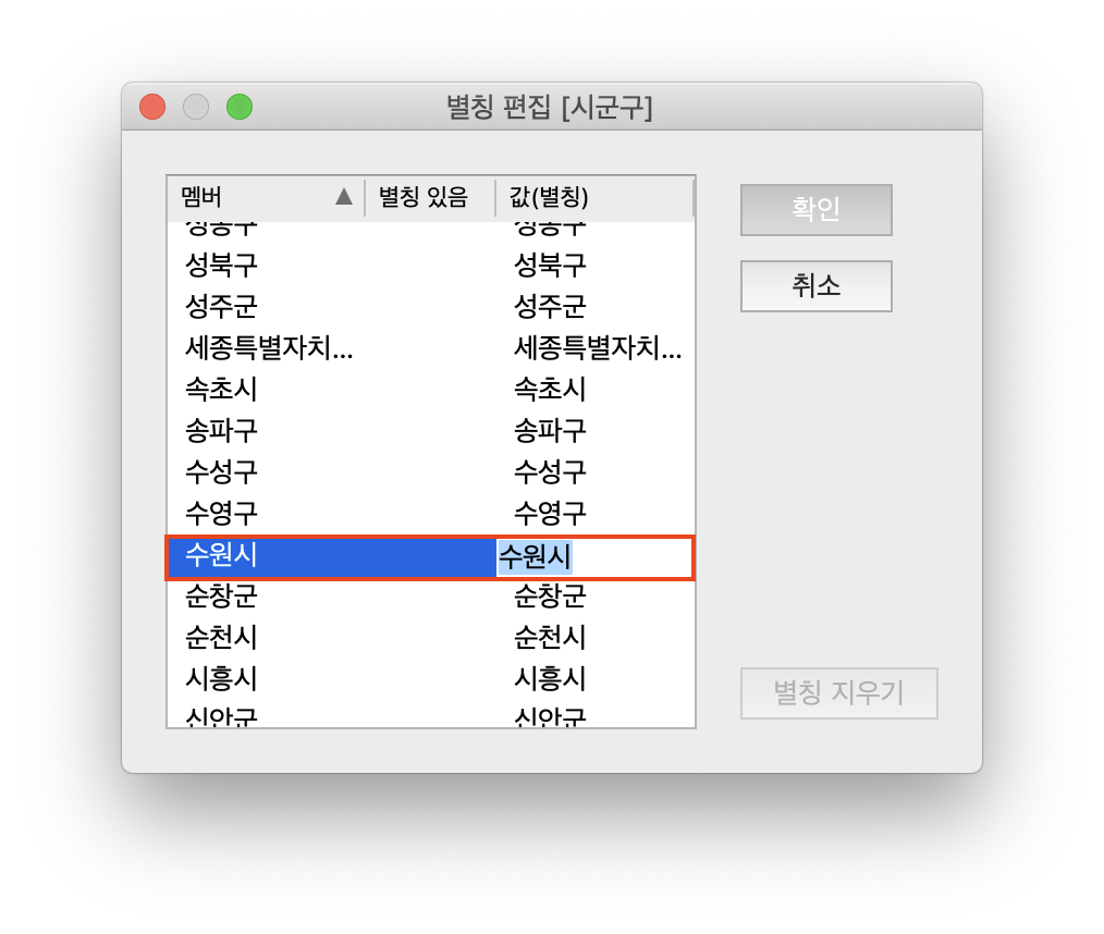 예를 들어, 아래의 그림 3처럼, '수원시'를 '수원특례시'로 이름을 변경해 봤습니다.