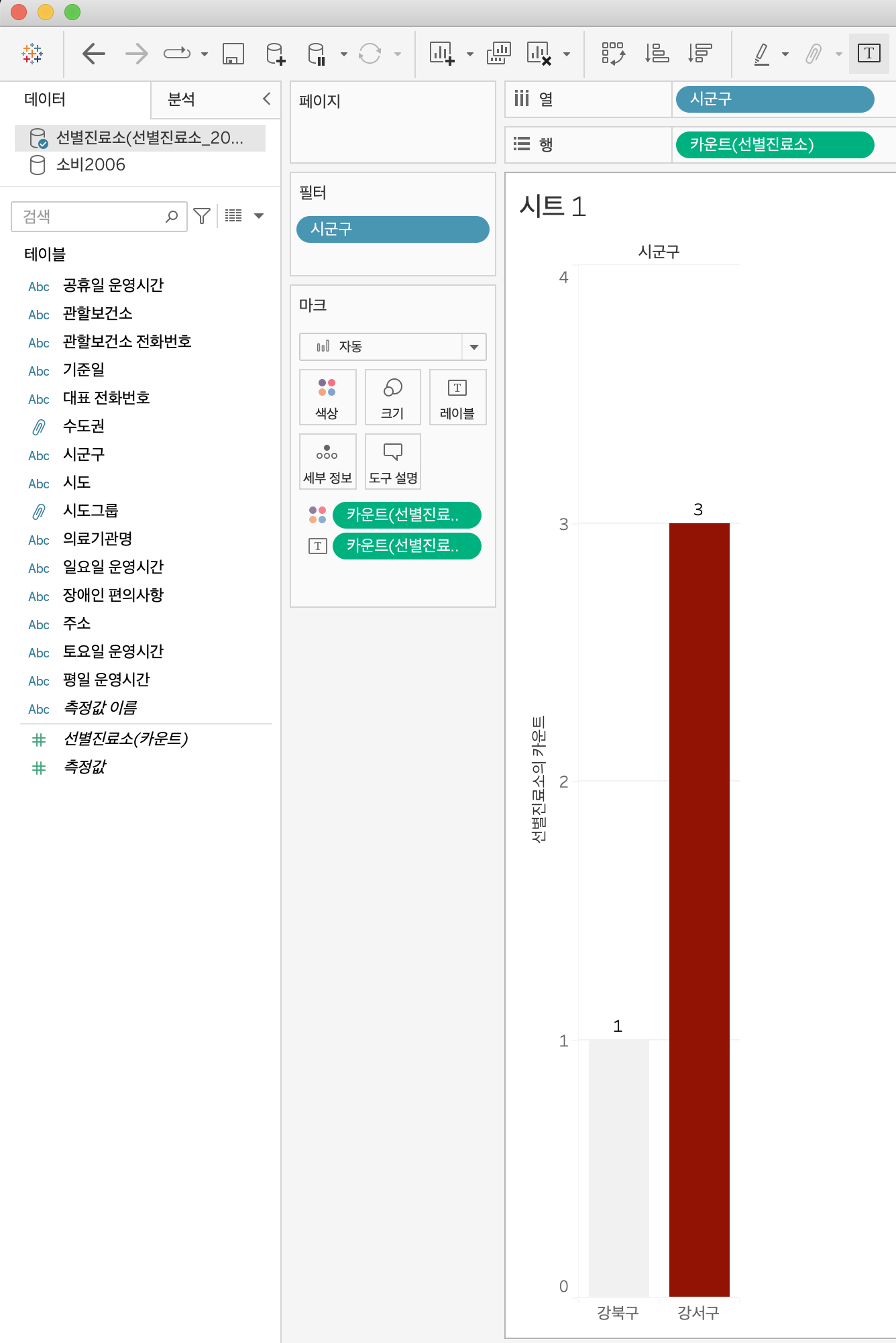 서울시 강북구와 강서구 지역만 분석하고 싶다면, 시/군/구 차원을 필터 선반에 드래그&드롭하면 됩니다.