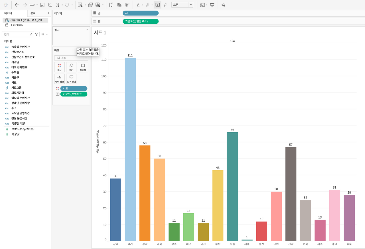 예를 들어, 위의 그림 5와 같이, 카운트 측정값을 마크카드 내 색상과 레이블에 드래그&드롭하면,
