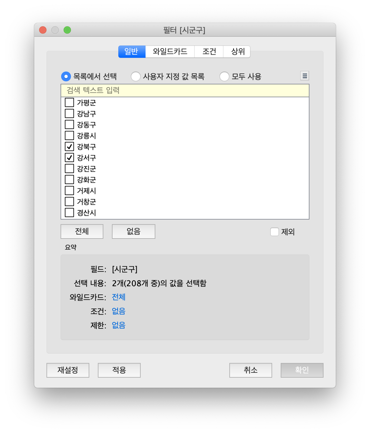 위의 그림 4와 같이, 강북구와 강서구만 선택하고, 우측 하단에 '확인' 버튼을 클릭합니다.