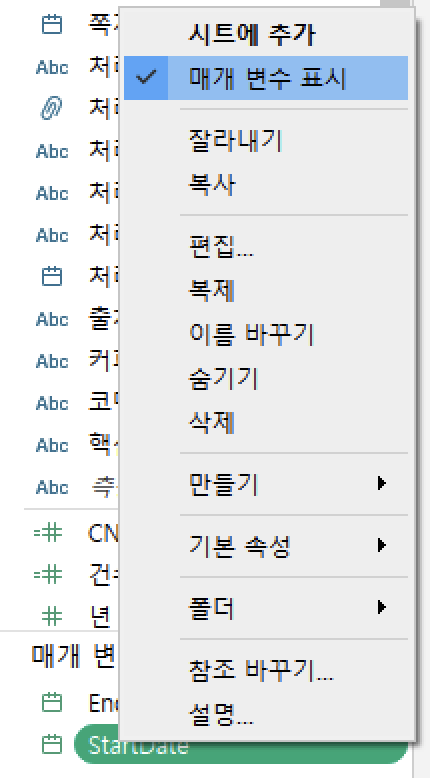 데이터 항목선반에 앞서 생성한 매개변수 각각의 이름에 마우스 우측 클릭 후 '매개 변수 표시'를 클릭합니다 (그림 11).