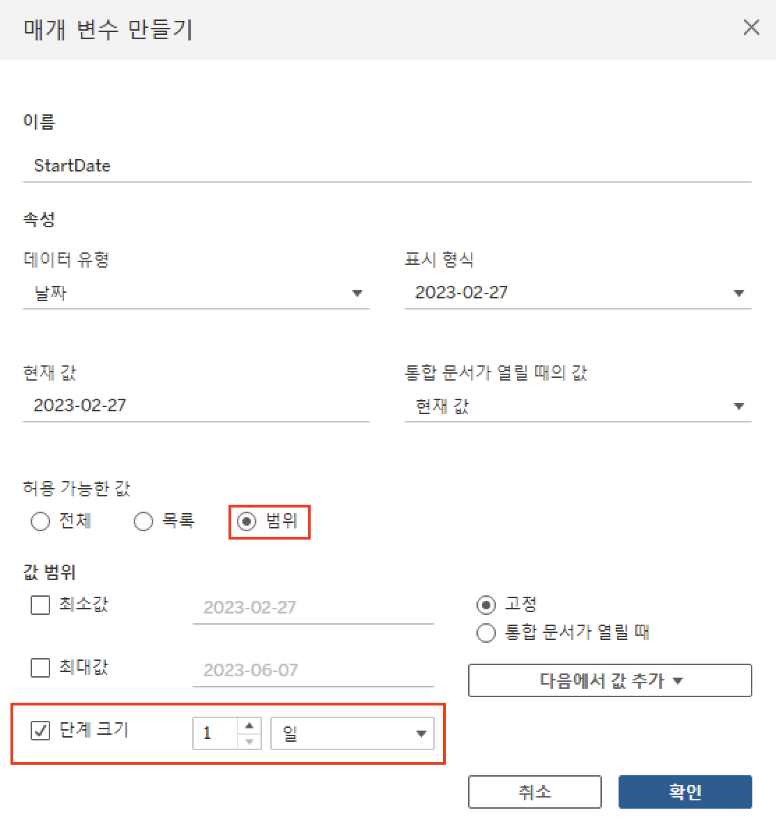 가장 먼저, 날짜 조회할 시작과 종료일 역할을 할 두 매개변수를 만들어 줍니다.