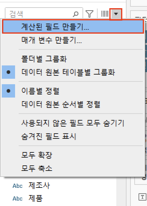 좌측 데이터 필드가 있는 탭에 아래 삼각형 아이콘(▼)을 클릭한 후 '계산된 필드 만들기'를 클릭합니다 (그림 7).