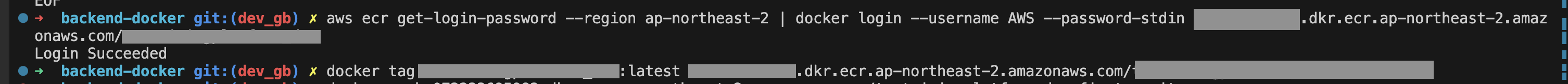 ์๋์ (๊ทธ๋ฆผ 1)๊ณผ ๊ฐ์ด, CLI ํตํด AWS ECR ๋ก๊ทธ์ธ ๋ฐ ๋์ปค ์ด๋ฏธ์ง ๋น๋ ํ๊น ๊น์ง ์๋ฃํ์์ต๋๋ค.