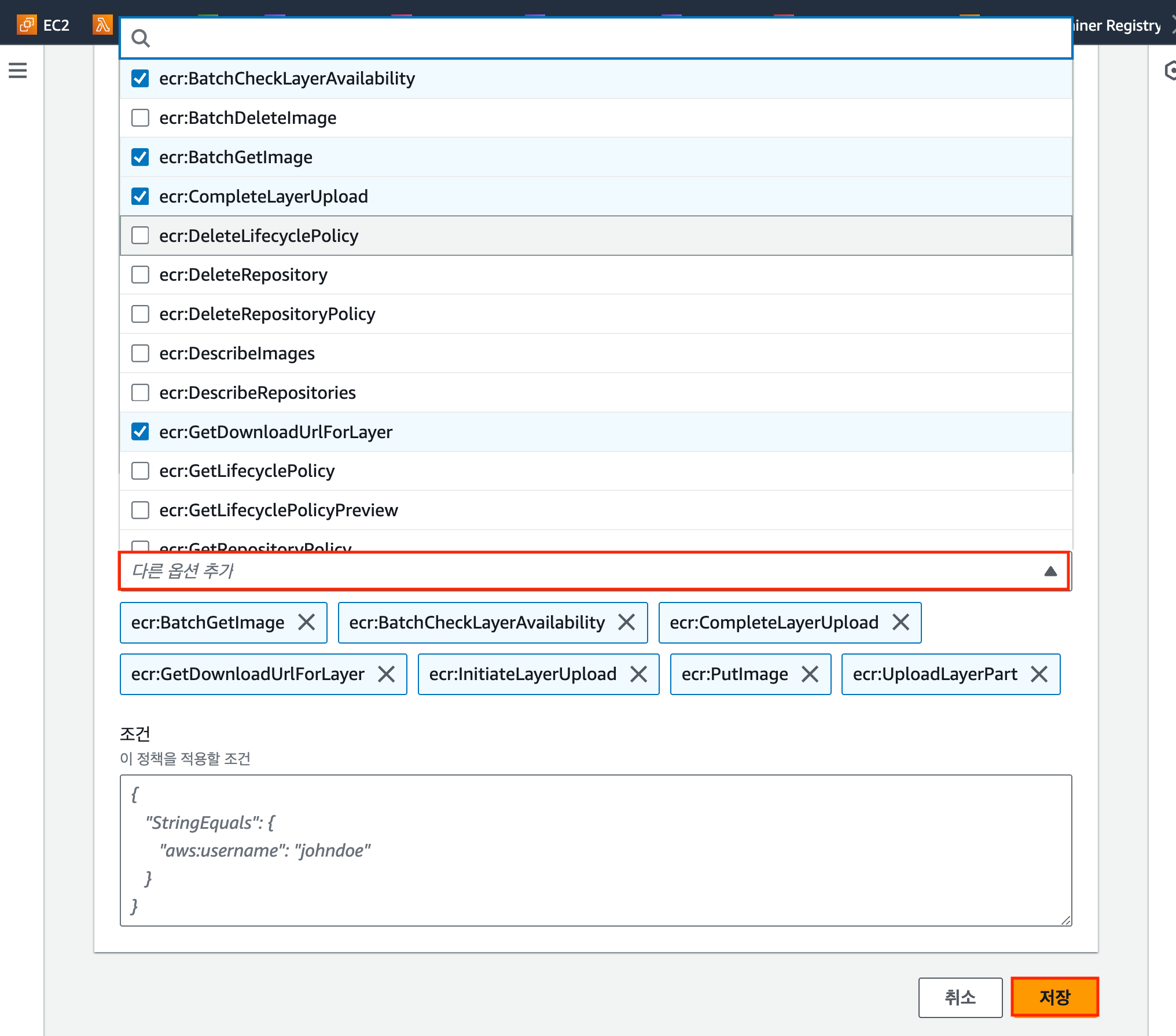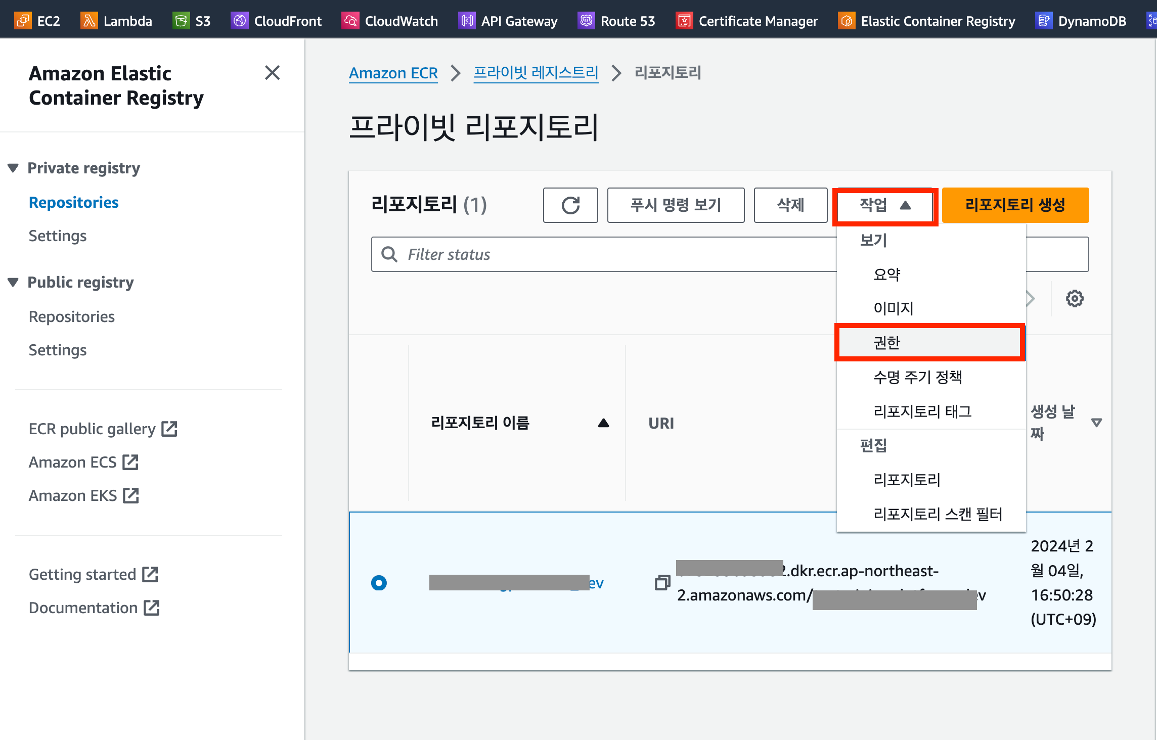 ์๋์ (๊ทธ๋ฆผ 3)๊ณผ ๊ฐ์ด AWS ECR Repository ์ฝ์ ๋ด '์์ ' > '๊ถํ' ๋ฒํผ์ ํด๋ฆญํ์ฌ ๊ถํ ์์ ํ์ด์ง๋ก ์ด๋ํด ์ค๋๋ค.