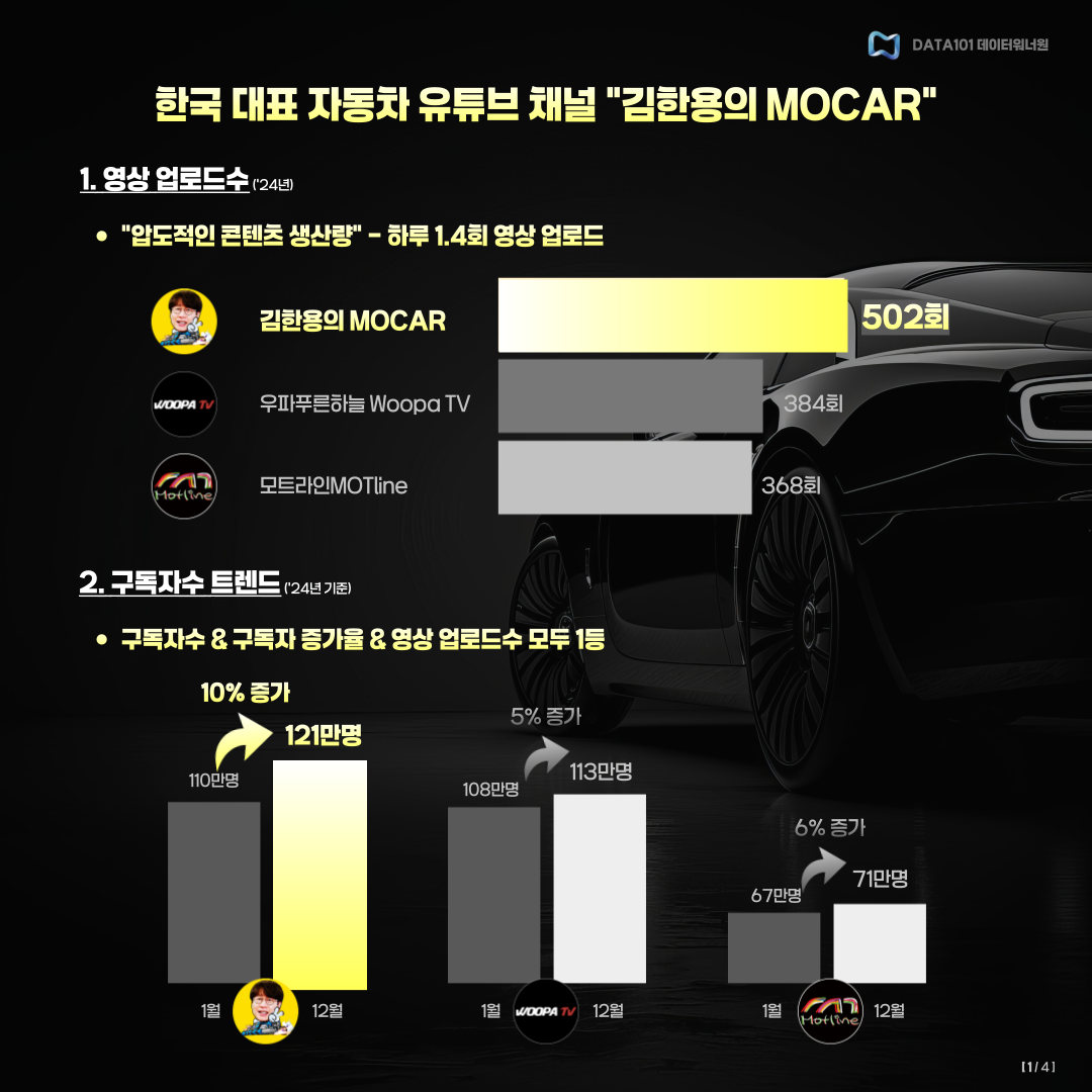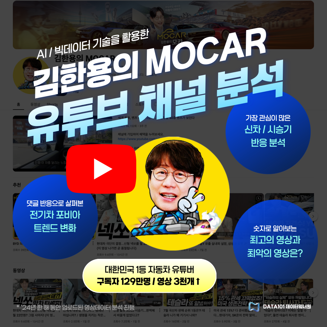 ์ค๋์ ์ ํฌ DATA101์์ ๋ํ๋ฏผ๊ตญ No.1 ์๋์ฐจ Youtube '๊นํ์ฉ์ MOCAR' ์ฑ๋์ ์ฌ์ธต ๋ถ์ํ ์ฌ๋ก๋ฅผ ์๊ฐํด ๋๋ฆฝ๋๋ค๐จ๐ป