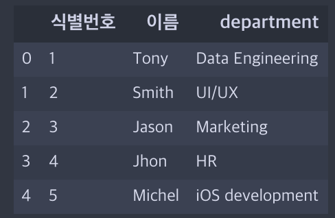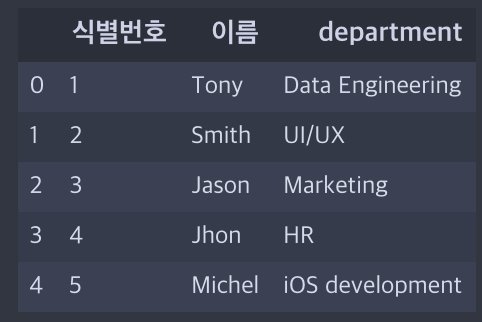 df = pd.DataFrame({"식별번호": [1, 2, 3, 4, 5], "이름": ["Tony", "Smith", "Jason", "Jhon", "Michel"],