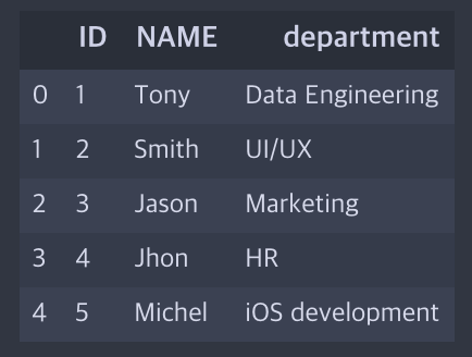 df.columns = ["ID", "NAME", "department"]