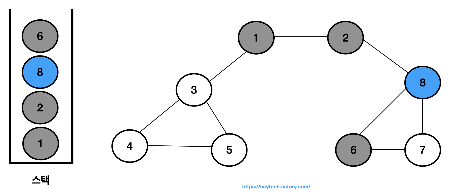 (7) 최상단 노드인 노드 8에도 인접하며 방문하지 않은 노드가 없으므로 스택에서 노드 8을 꺼냅니다.