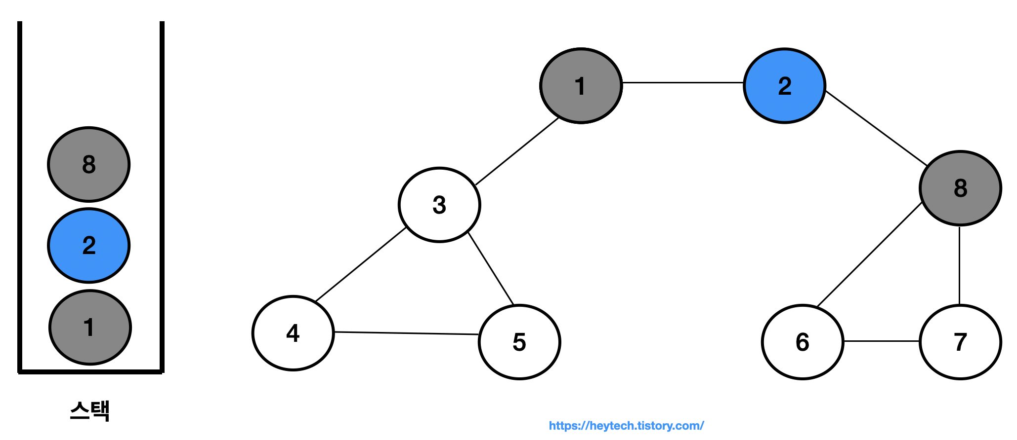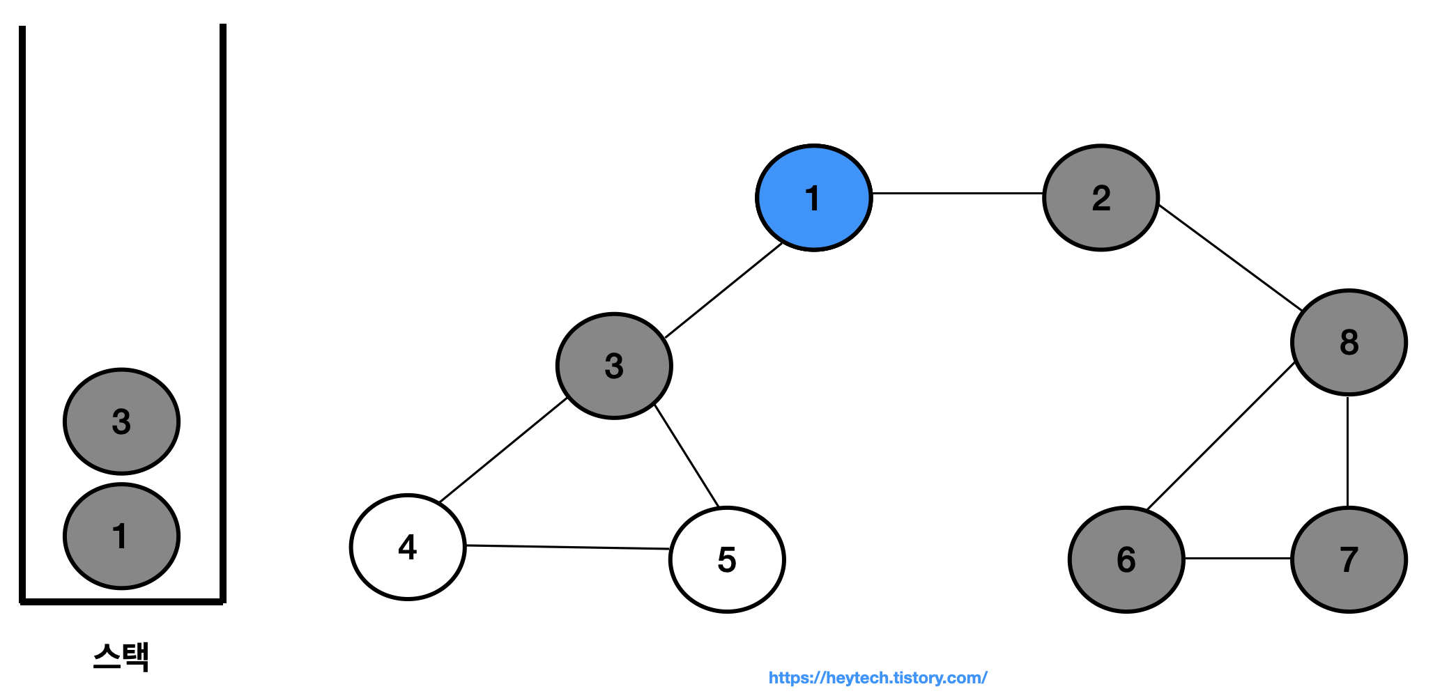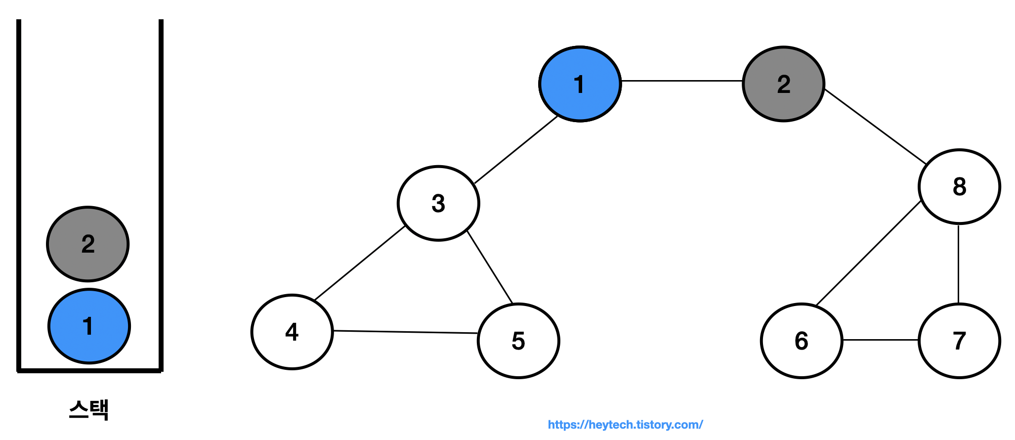 이제 아래 그림 1 과 같은 그래프 예시를 통해 DFS 동작 과정을 알아보겠습니다. 노드 1을 시작 노드로 설정하겠습니다. 일반적으로 인접한 노드가 2개 이상인 경우에는 해당 노드들 중 번호가 낮은 노드부터 처리합니다. 편의상 현재 처리 중인 스택 내 최상단 노드는 파란색으로,방문 처리한 노드는회색으로 표시하겠습니다.
