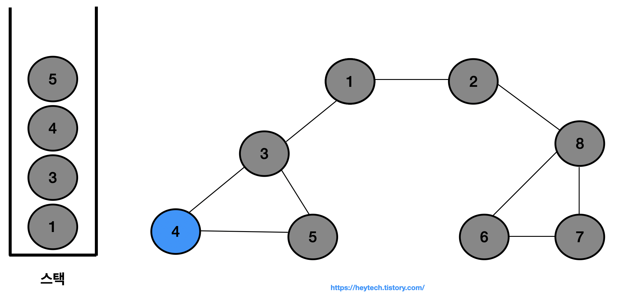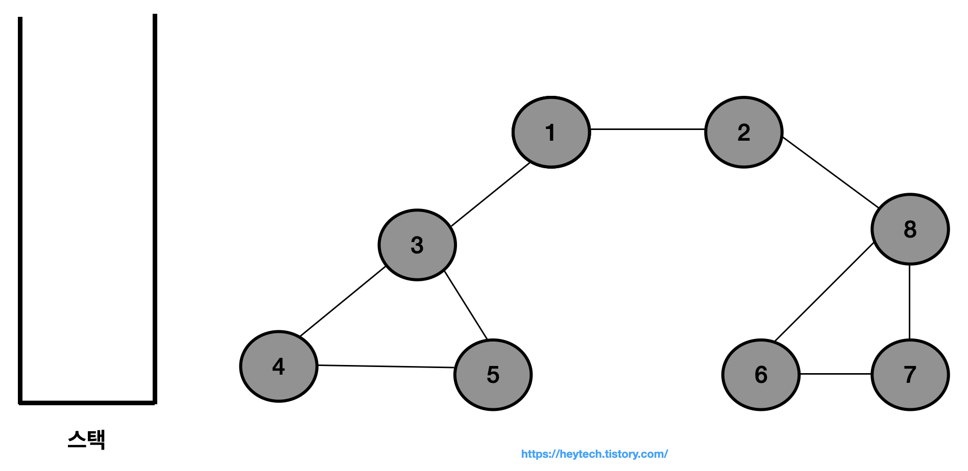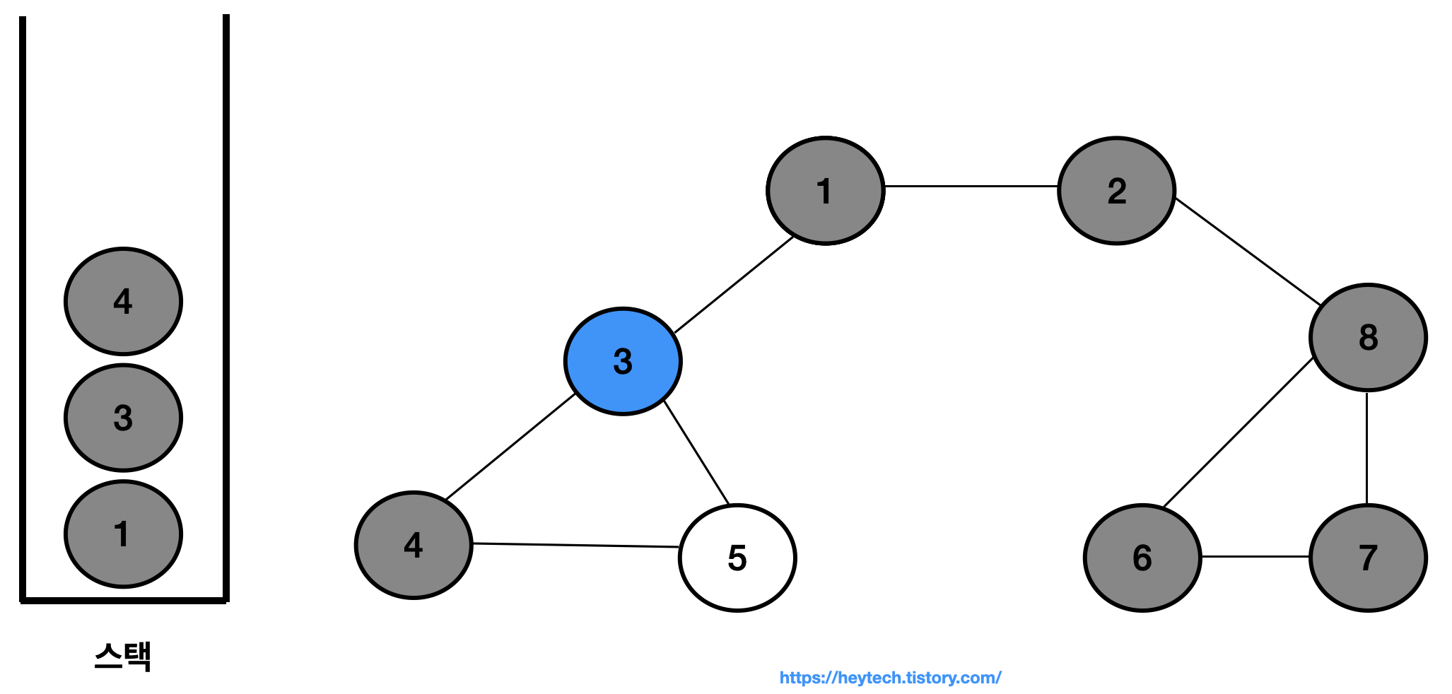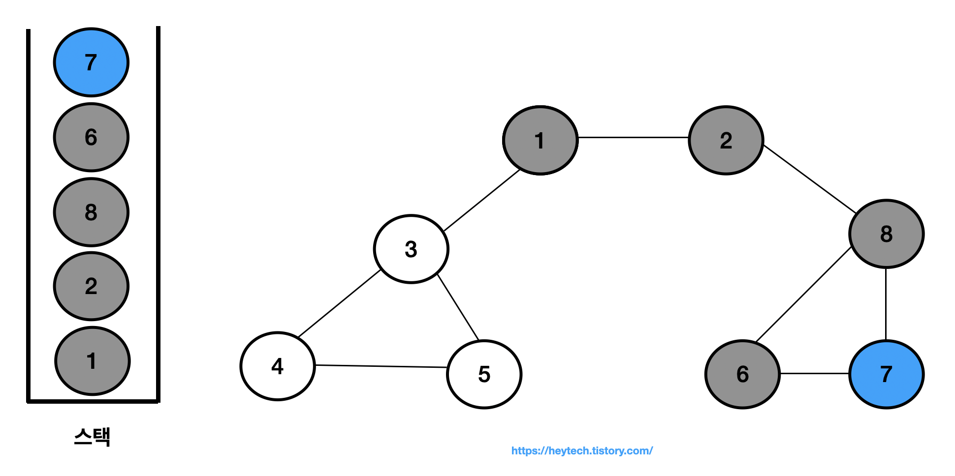 이제 아래 그림 1 과 같은 그래프 예시를 통해 DFS 동작 과정을 알아보겠습니다. 노드 1을 시작 노드로 설정하겠습니다. 일반적으로 인접한 노드가 2개 이상인 경우에는 해당 노드들 중 번호가 낮은 노드부터 처리합니다. 편의상 현재 처리 중인 스택 내 최상단 노드는 파란색으로,방문 처리한 노드는회색으로 표시하겠습니다.