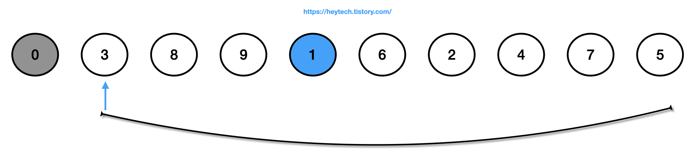 편의상 정렬되지 않은 데이터 중에서 가장 작은 값을 파란색으로, 정렬된 데이터는 회색으로 표현하겠습니다. 추가로 가장 작은 값과 자리를 변경할 데이터를 파란색 화살표로 표시하겠습니다.