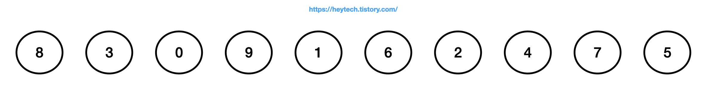 이제 예시와 함께 선택 정렬의 구체적인 동작 과정을 알아보도록 하겠습니다. 그림 1 과 같이 정렬 없이 정수 10개가 무작위로 배치되어 있을 때 선택 정렬을 활용해서 오름차순으로 정렬해 보도록 하겠습니다.