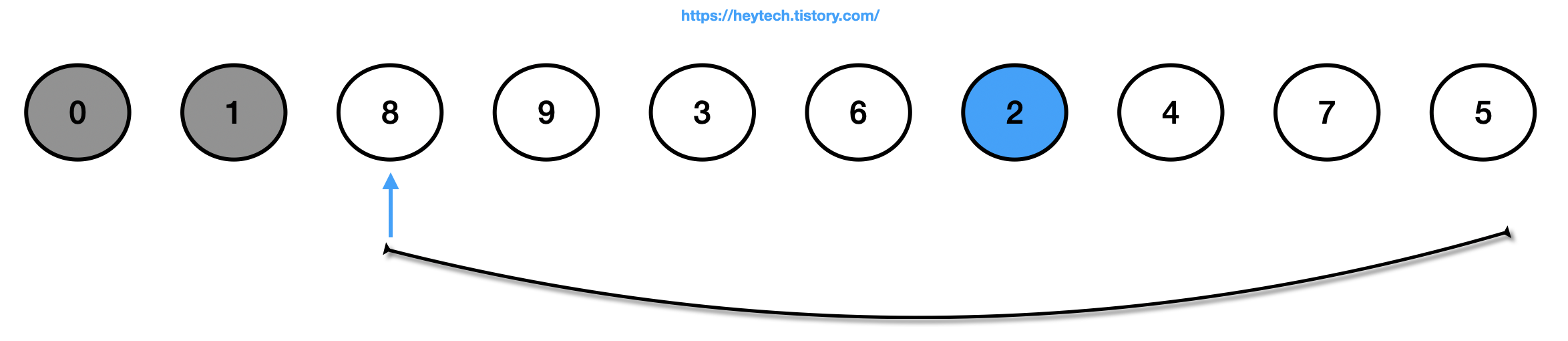 (3) 정렬되지 않은(회색 제외) 데이터에서 가장 작은 값인 2를 선택하고 맨 앞에 있는 값인 8과 자리를 바꿉니다.