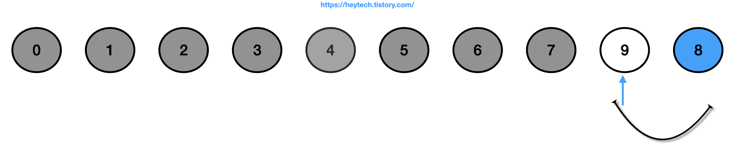 (9) 정렬되지 않은(회색 제외) 데이터에서 가장 작은 값인 8을 선택하고 맨 앞에 있는 값인 9와 자리를 바꿉니다.
