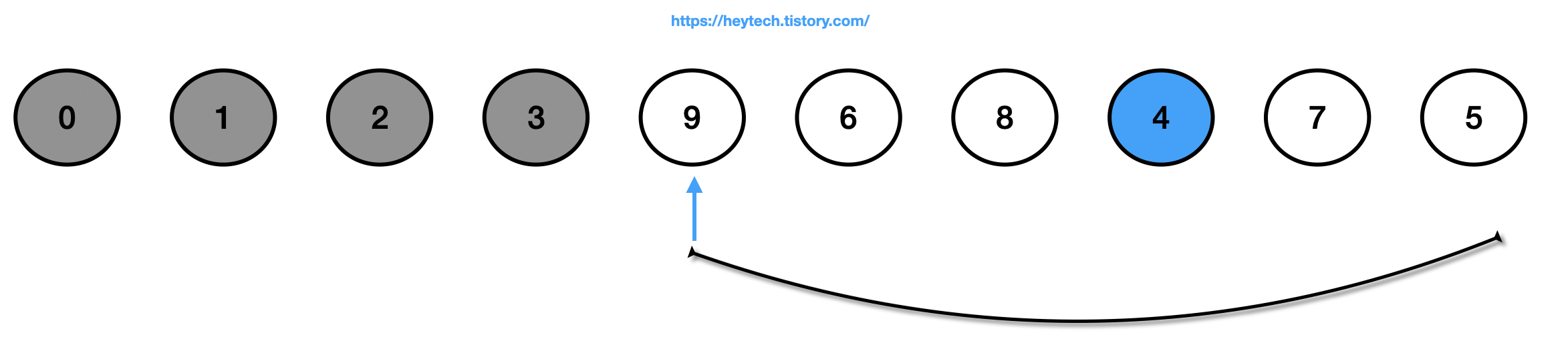 (5) 정렬되지 않은(회색 제외) 데이터에서 가장 작은 값인 4를 선택하고 맨 앞에 있는 값인 9와 자리를 바꿉니다.