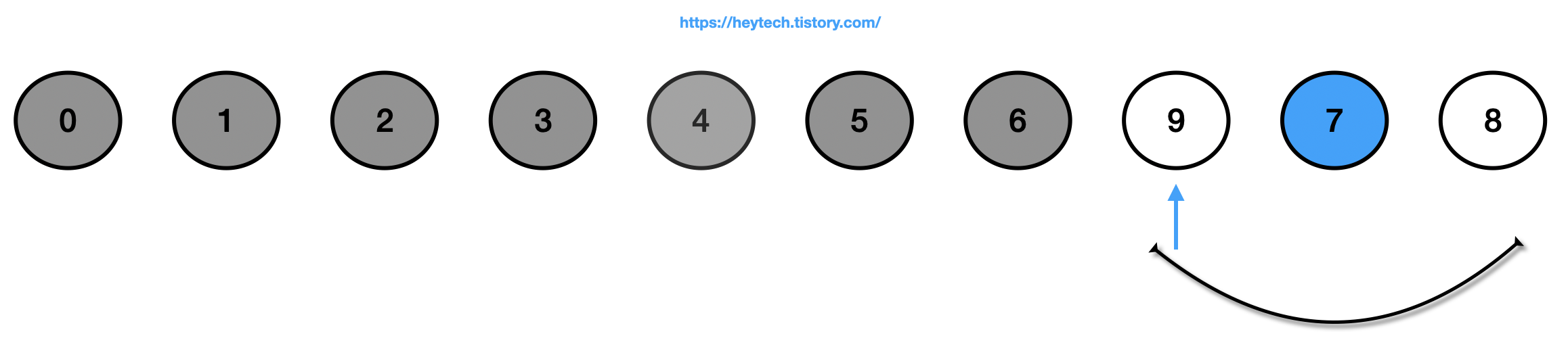(8) 정렬되지 않은(회색 제외) 데이터에서 가장 작은 값인 7을 선택하고 맨 앞에 있는 값인 9와 자리를 바꿉니다.