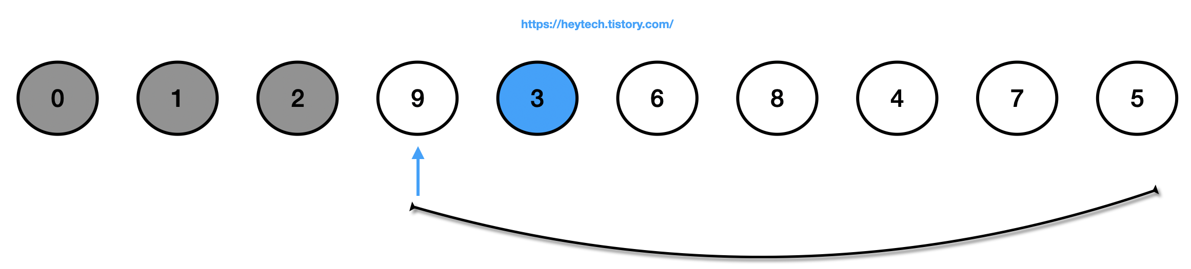 (4) 정렬되지 않은(회색 제외) 데이터에서 가장 작은 값인 3을 선택하고 맨 앞에 있는 값인 9와 자리를 바꿉니다.