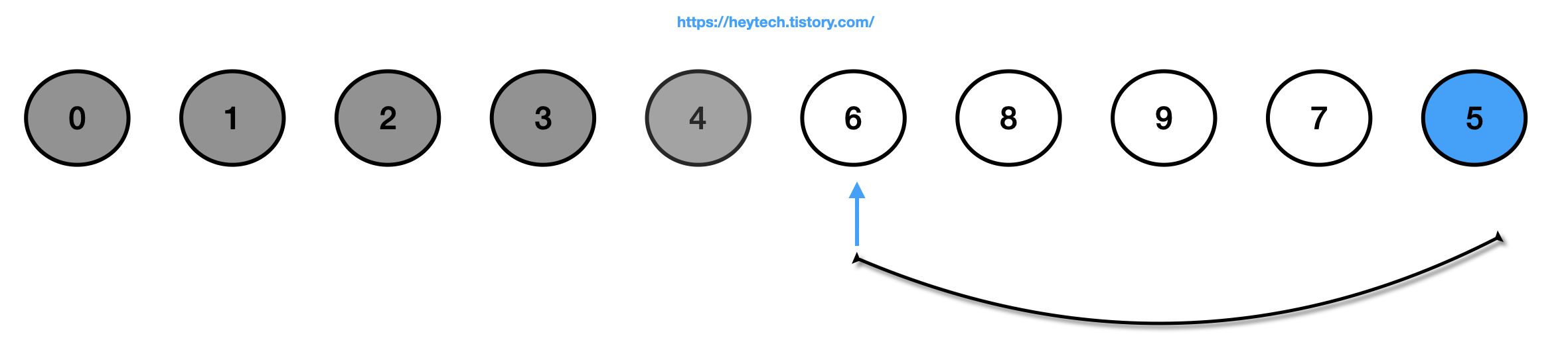 (6) 정렬되지 않은(회색 제외) 데이터에서 가장 작은 값인 5를 선택하고 맨 앞에 있는 값인 6과 자리를 바꿉니다.
