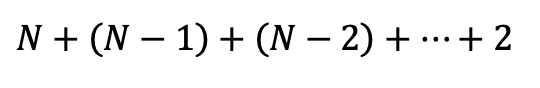 선택 정렬의 시간 복잡도를 계산하면 다음과 같습니다. 앞서 살펴본 것처럼 N개의 데이터가 있을 때 N-1번만큼 가장 작은 데이터를 찾고 맨 앞으로 보내는 과정이 필요합니다. 구현 방식에 따라 미세한 차이가 있을 수 있지만, 앞서 예시로 활용한 그림처럼 구현하게 되면 총 연산 횟수는 아래 수식 1 만큼 필요합니다.