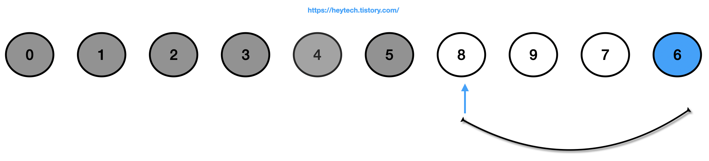 (7) 정렬되지 않은(회색 제외) 데이터에서 가장 작은 값인 6을 선택하고 맨 앞에 있는 값인 8과 자리를 바꿉니다.