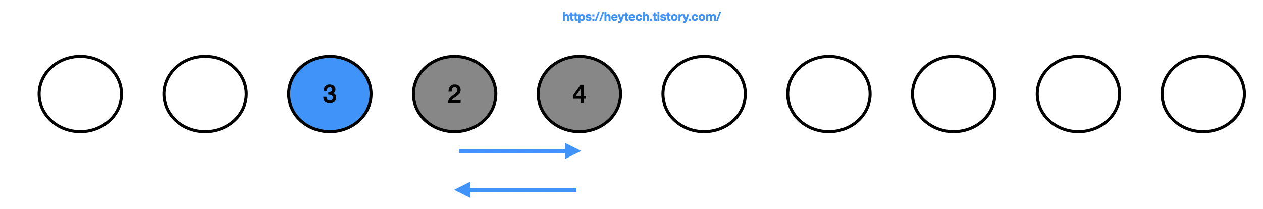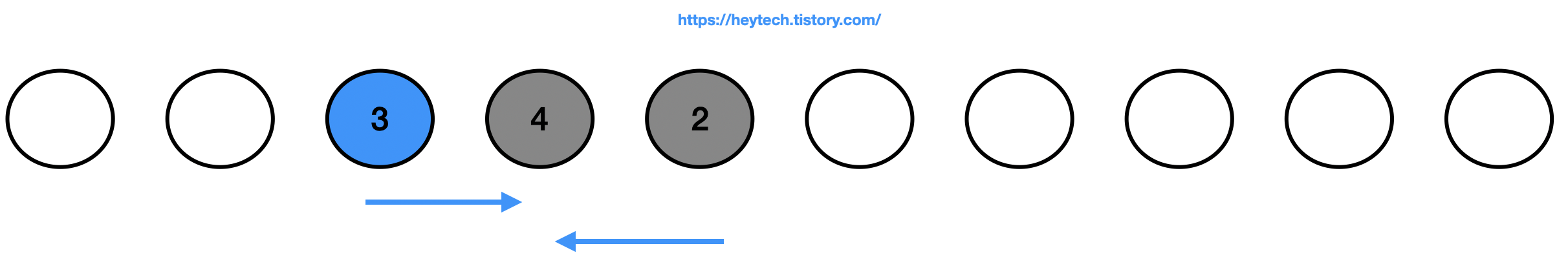 5) 이제 다시 좌측/우측 리스트에 대하여 각각 퀵 정렬을 수행합니다. 좌측 리스트는 데이터가 1개로 이미 정렬이 완료되었다고 가정할 수 있으며 추가적인 분할은 불가능합니다. 우측 리스트에 대해 퀵 정렬을 수행하면 맨 앞에 있는 3이 피벗으로 설정됩니다. 좌측에서 우측 방향으로 피벗보다 큰 값인 4와 우측부터 좌측 방향으로 피벗보다 작은 값인 2를 찾았습니다. 두 데이터의 위치를 서로 변경해 줍니다.