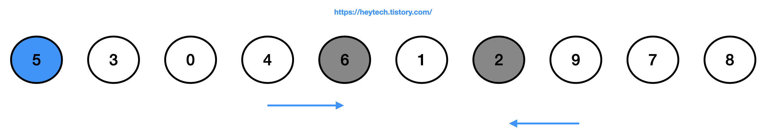3) 데이터가 변경된 위치에서 다시 피벗을 기준으로 데이터를 찾습니다. 이렇게 찾은 6과 2의 위치를 변경해 줍니다.