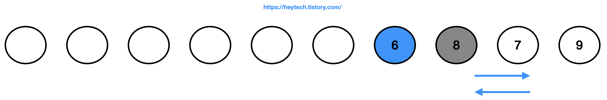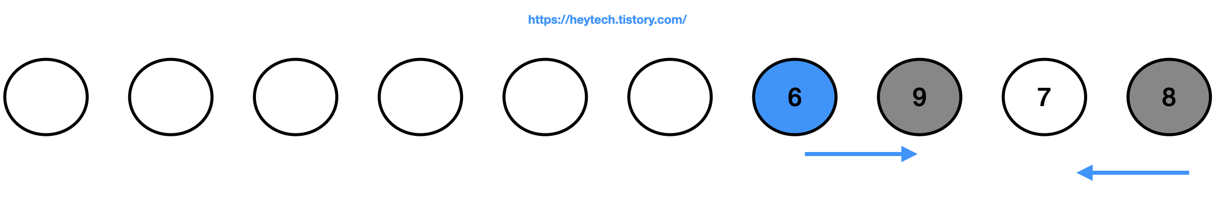 2) 좌측에서 우측 방향으로 피벗인 6보다 큰 값인 9를 찾았습니다. 하지만 우측에서 좌측 방향으로 피벗보다 작은 값은 찾지 못 했습니다. 따라서 앞서 찾은 9와 가장 우측에 있는 8의 위치를 서로 변경합니다.