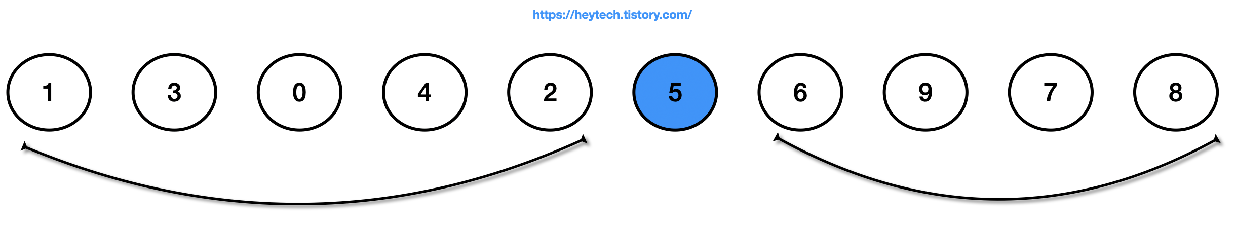 왜냐하면 좌측 리스트는 어떻게 정렬해도 반드시 초기 피벗인 5보다 작으며, 우측 리스트는 어떻게 정렬해도 반드시 5보다 크기 때문입니다.