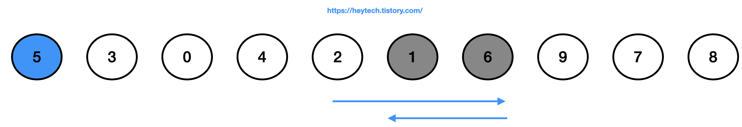 1️⃣ 리스트 좌측에서 우측 방향으로 피벗보다 큰 데이터를 찾고, 리스트 우측에서 좌측 방향으로 피벗보다 작은 데이터를 찾습니다.
