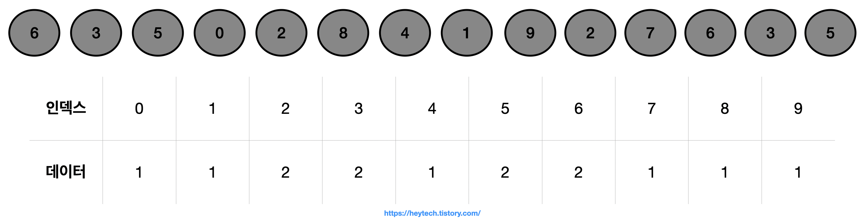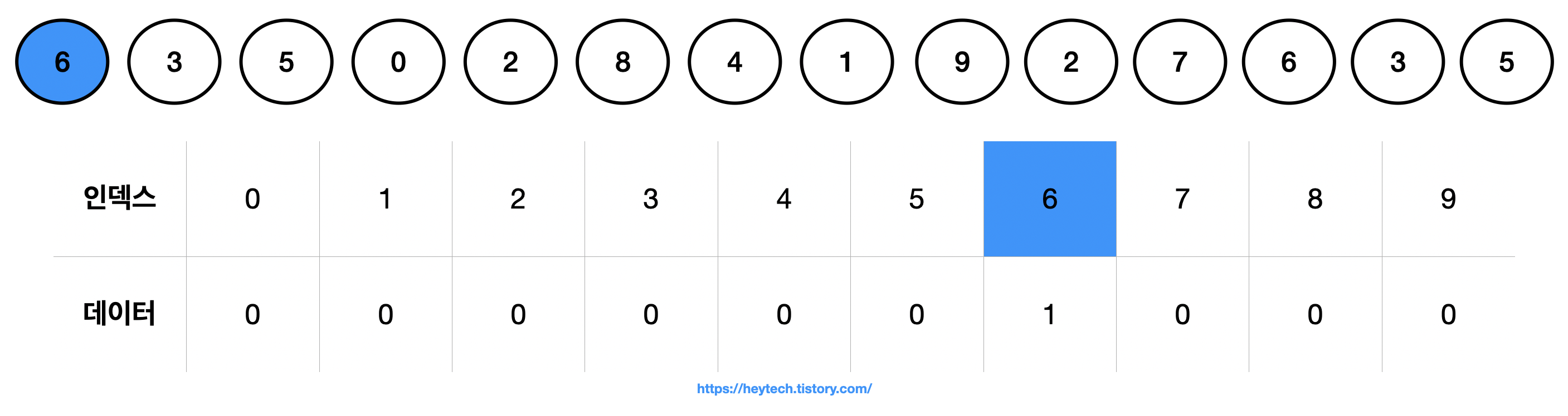 (1) 먼저 가장 작은 값인 0부터 가장 큰 값인 9까지 모든 범위를 포함할 수 있는 크기 10인 리스트를 생성하고, 리스트 내 모든 인덱스의 데이터가 0이 되도록 초기화하겠습니다. 이제 그림 1 의 리스트 내 좌측부터 차례대로 데이터 값과 일치하는, 앞서 생성한 리스트 내 인덱스의 데이터를 1씩 추가해 줍니다.