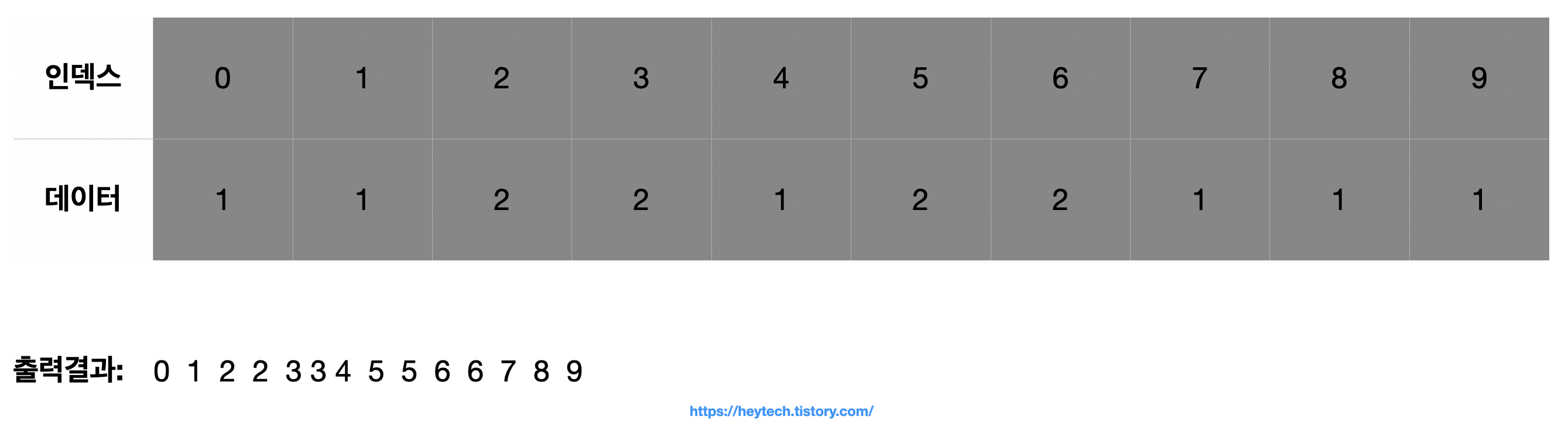 (1) 정렬된 결괏값을 확인하기 위해서는 앞서 기록한 리스트에서 인덱스를 데이터 값만큼 출력하면 됩니다. 예를 들어, 인덱스 0의 데이터는 1이므로 0을 1번만 출력합니다.