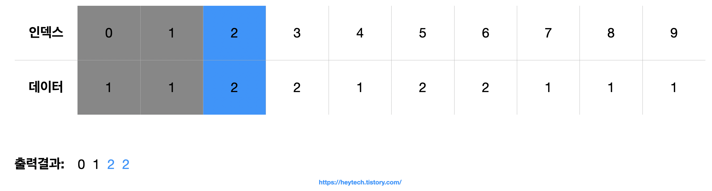 (3) 다음으로 인덱스 2의 데이터 값이 2이므로 2를 2번 출력합니다.