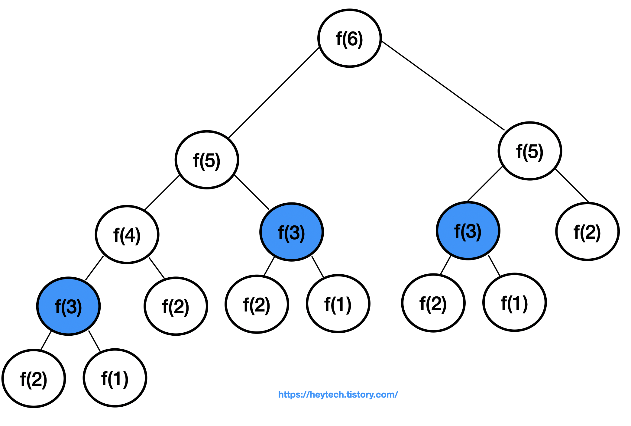 연산 횟수가 이렇게 기하급수적으로 증가하는 이유는 무엇일까요? 그림 2 에서 파란색으로 표시한 것처럼 3번째 피보나치 수를 구하는 연산은 3회씩이나 불필요하게 반복되는 것을 확인하실 수 있습니다. 다시 말해, \(f(3)\)은 3회 호출된 것이죠.