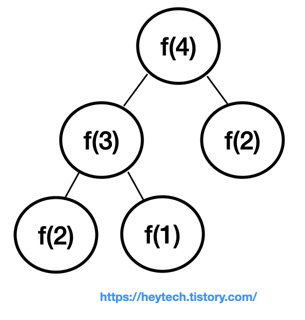 \(n\)번째 피보나치 수를 \(f(n)\)이라고 할 때, 4번째 피보나치 수인 \(f(4)\)를 구하기 위해서는 함수 \(f\)를 \(f(1)\)이나 \(f(2)\)를 마주할 때까지 \(f\)를 반복 수행해야 합니다. 아래 그림 1 은 \(f(4)\)를 구하는 과정입니다. 즉, \(f(3)\)과 \(f(2)\)를 먼저 구하고, \(f(3)\)을 구하기 위해 다시 \(f(2)\)와 \(f(1)\)을 구해야 합니다.