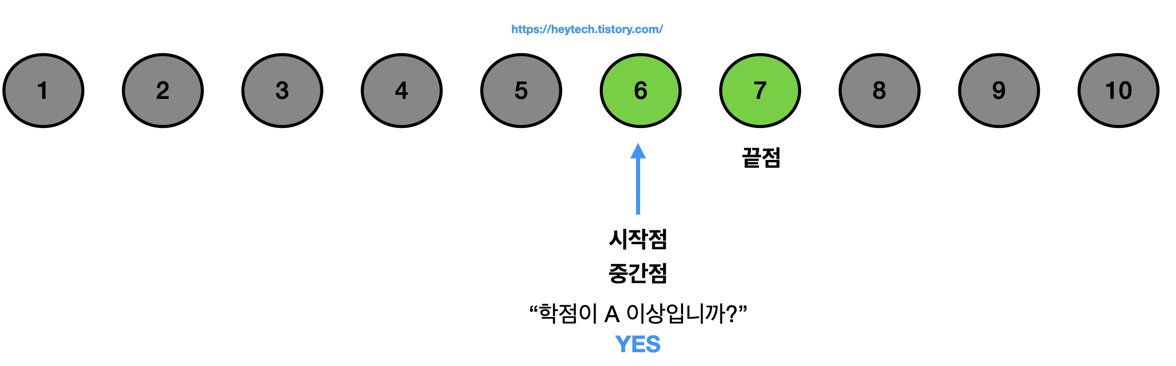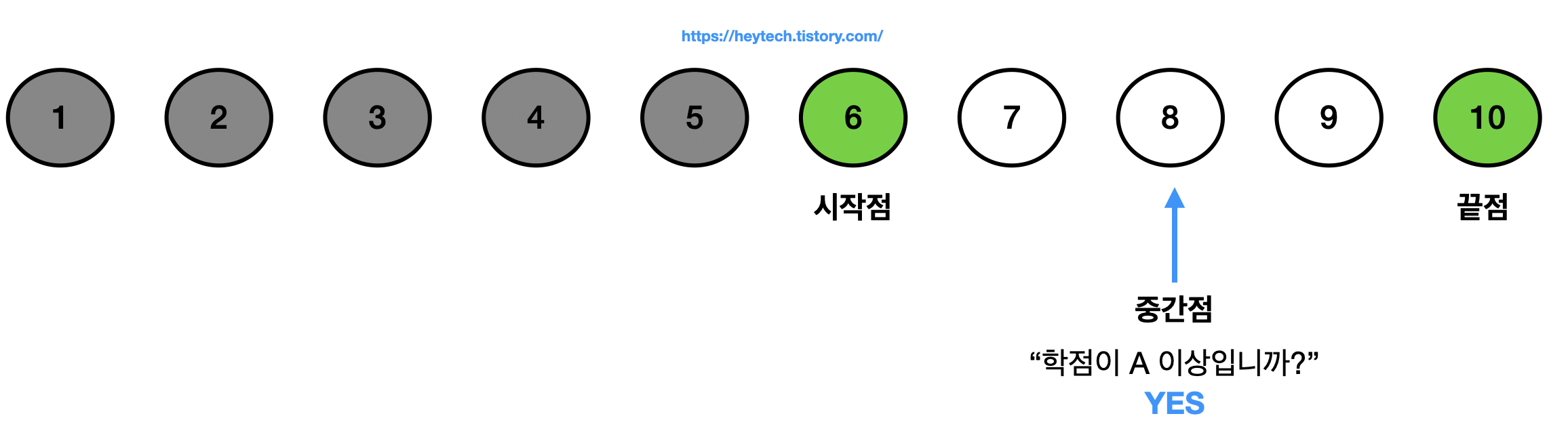 (3) 마찬가지로 8번 사람이 A 학점 이상이며 9번, 10번 사람은 8번 사람보다도 성적이 높기 때문에 8반 사람 이후로는 학점을 물어보지 않아도 됩니다(그림 4 참고). 이제 끝점을 중간점의 한 칸 앞인 7로 옮기면 새로운 중간점은 시작점과 같은 6이 됩니다. 중간점에 해당하는 사람이 A 학점 이상이라고 답했기 때문에, A 학점이면서 성적이 가장 낮은 사람은 6번 사람임을 알 수 있습니다. 만일 6번이 A 학점이 아닐 경우에는 7번 사람의 학점도 알 수 없기 때문에 한 번 더 학점을 물어봐야 합니다.