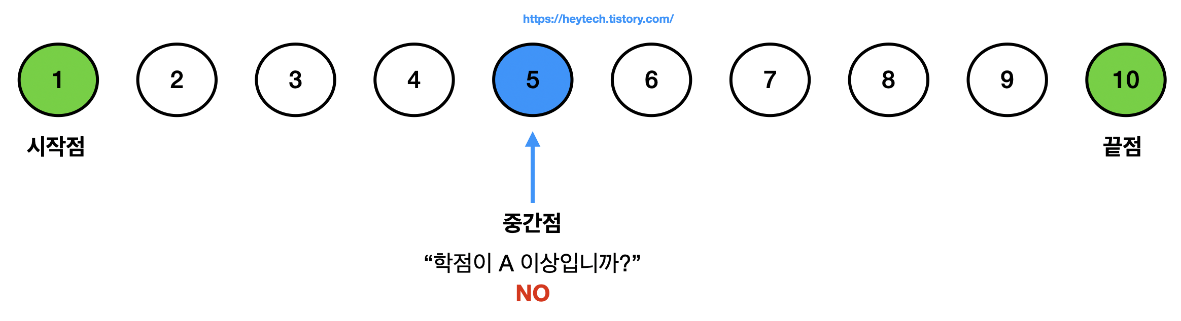 (1) 먼저 시작점인 1과 끝점인 10의 중간점은 \(\frac{(1+10)}{2} = 5.5\) 에서 소수점 이하를 버린 5입니다. 중간점이 조건을 만족하는지 확인합니다(그림 2 참고). 편의상 시작점과 끝점은 녹색으로, 중간점은 파란색으로 표현하겠습니다. 중간점인 5가 조건을 만족하지 않는다면, 이미 1부터 10번까지의 사람이 성적 순으로 정렬되어 있다는 점에서, 사실상 5번을 포함해 번호가 낮은 사람들에 대해서는 조건의 만족 여부를 검증해 볼 필요가 없습니다.