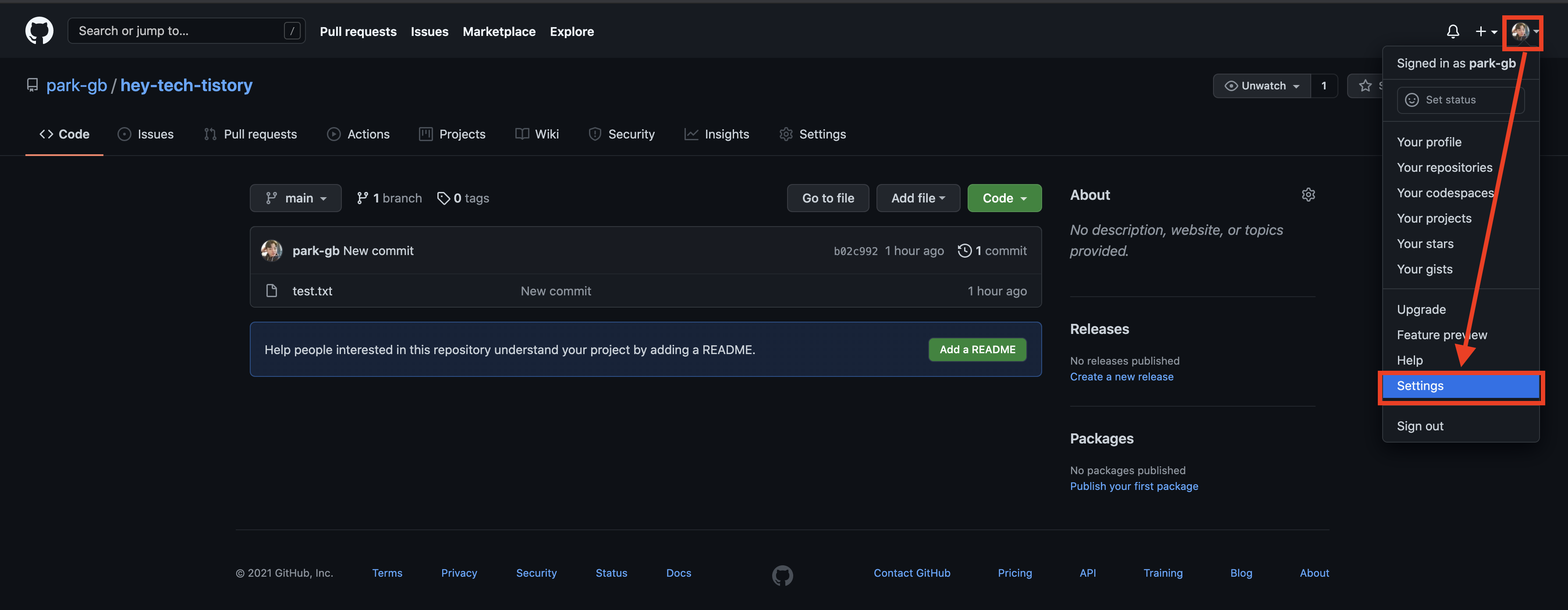 1) 깃허브 사이트에서 setting 클릭(cf. 그림 2)