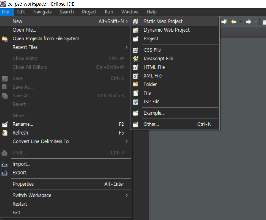์๋จ ๋ฉ๋ด๋ฐ์์ File > New > Static Web Project์ ์ฐจ๋ก๋ก ํด๋ฆญํ์ฌ ์ ์ ์ธ ์น ํ๋ก์ ํธ๋ฅผ ์์ฑํฉ๋๋ค.