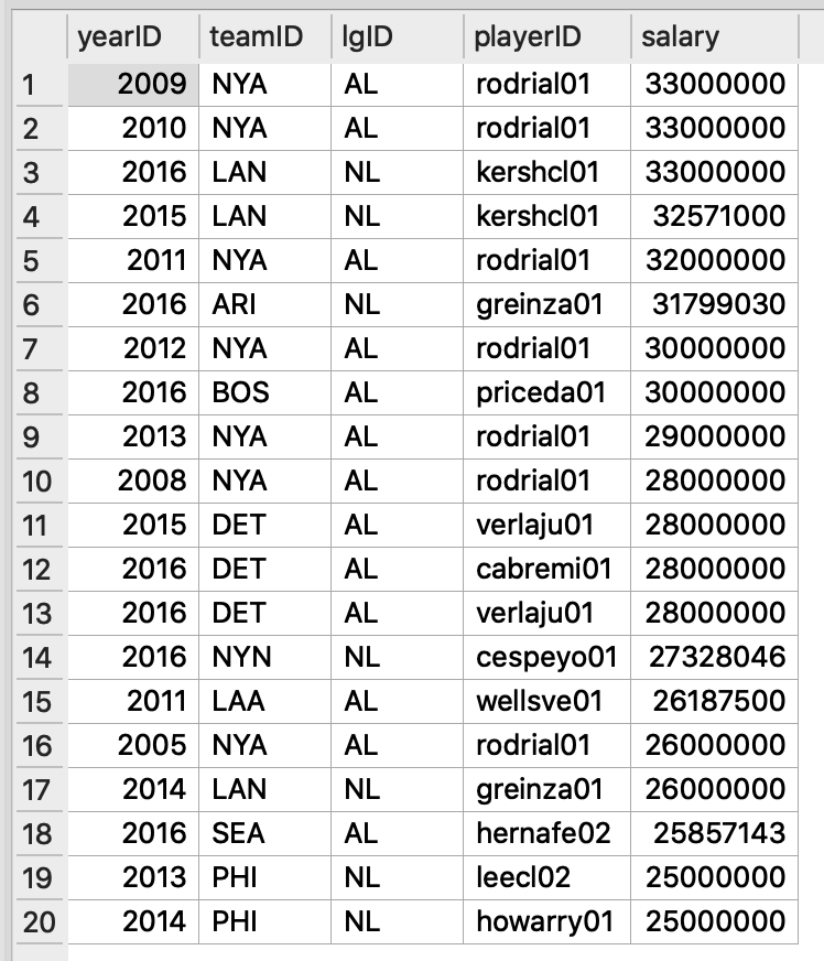 "rodrial01"이라는 ID를 가지는 선수가 가장 많은 연봉을 받았던 것을 확인할 수 있습니다.