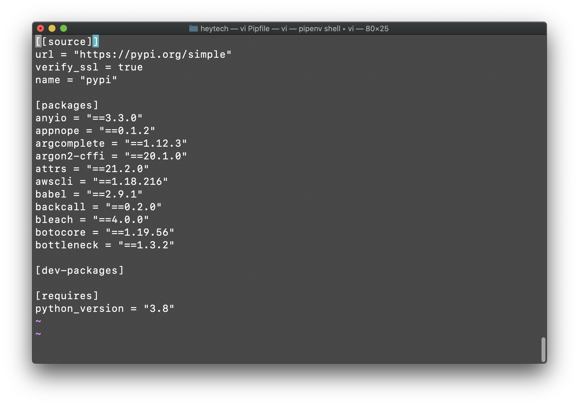 pipenv๋ฅผ ํตํด ํจํค์ง๋ฅผ ์ค์นํ ํ, Pipfile์ ์ด์ด๋ณด์๋ฉด packages ๋ฆฌ์คํธ์ ์๋ก์ด ํจํค์ง๊ฐ ์ค์น๋ ๊ฒ์ ํ์ธํ์ค ์ ์์ต๋๋ค.