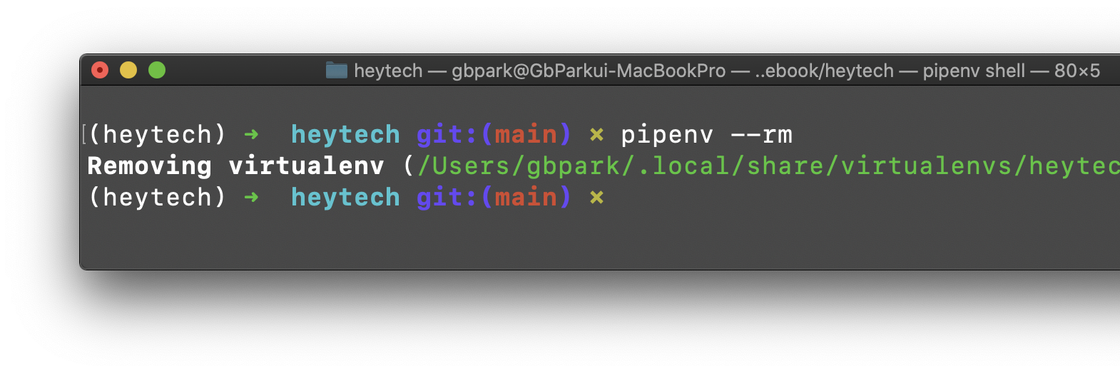 pipenv ๋ค์ --rm ์ต์ ์ ์ ๋ ฅํ๋ฉด ๊ฐ์ํ๊ฒฝ์ ์ญ์ ํ ์ ์์ต๋๋ค.