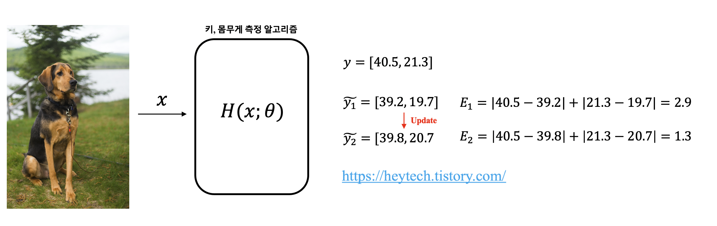 MAE는 회귀(Regression) 문제에 자주 활용됩니다. 예를 들어, 아래의 그림 3와 같이 사진을 통해 강아지의 키와 몸무게를 예측하는 알고리즘이 있다고 가정해 보겠습니다. 사진 속 강아지의 키와 몸무게는 실제로 각각 \([40.5, 21.3]\)라고 해보겠습니다. 이제 알고리즘은 강아지의 키와 몸무게를 예측합니다. 처음에 키와 몸무게를 각각 \([39.2, 19.7]\)로 예측했다고 가정하겠습니다. MAE를 계산해 보면 \(2.9\)입니다. 다음 예측에서는 \([39.8, 20.7]\)로 출력했다면 MSE는 \(1.3\)입니다. 이처럼 MAE를 활용하여 \(\theta\)를 변경해 가며 오차를 줄여갈 수 있습니다.