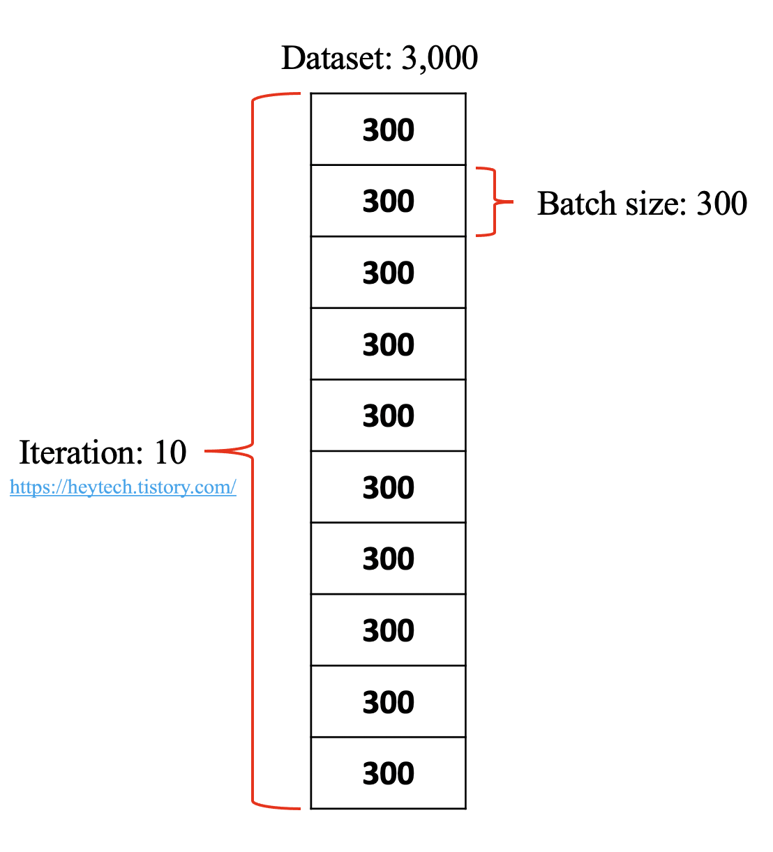 Iteration는 전체 데이터에 대해 총 Batch의 수를 의미하며, '이터레이션'이라고 읽고 Step이라고 부르기도 합니다. 앞서 Batch 크기가 전체 데이터셋을 몇 개의 데이터 묶음으로 한 번씩 파라미터를 업데이트할지 결정한다고 했습니다. 아래의 그림 2와 같이, Batch 크기가 300이고 전체 데이터 개수가 3,000이라면 전체 데이터셋을 학습시키기 위해서는 총 10개의 Batch가 필요합니다. 10번에 걸쳐 파라미터를 업데이트해야 되니까 말이죠. 즉, Iteration의 수는 10입니다. 여기서 주의할 점은 Batch 크기가와 개수는 다른 개념이라는 것입니다.