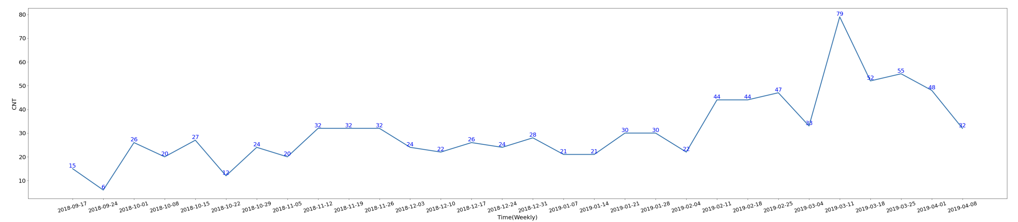 matplotlib 패키지를 활용하였으며, x축은 주 단위, y축은 데이터 건수로 시각화하였습니다. 전체 데이터 중 30주만 출력해 봅니다.